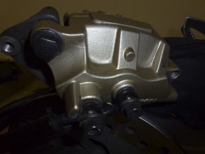 6)Očistěte třmen, zvláštní pozornost věnujte vodícím drážkám desek. Desky musí ve třmenu chodit naprosto volně. Zkontrolujte, zda také třmen chodí volně. Drážkám věnujte zvláštní pozornost, pokud jsou desky opotřebované nerovnoměrně, tj. Jedna více než druhá.