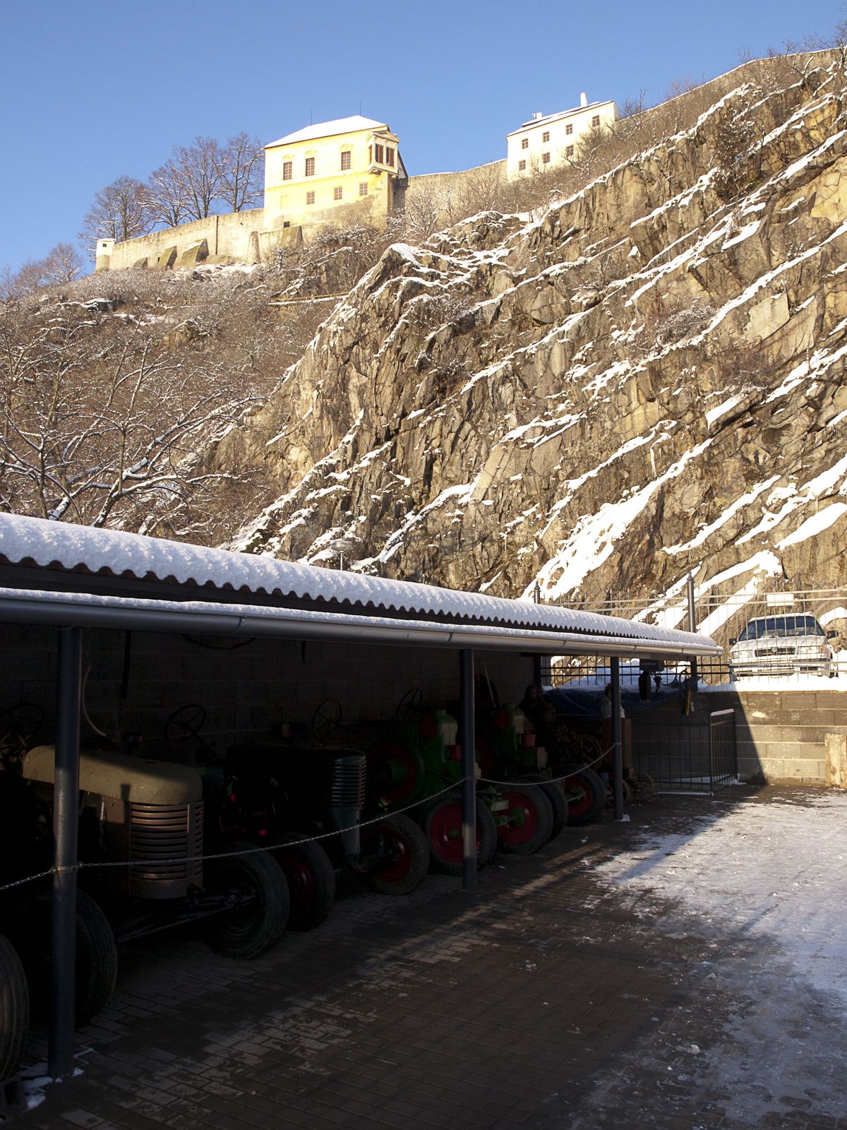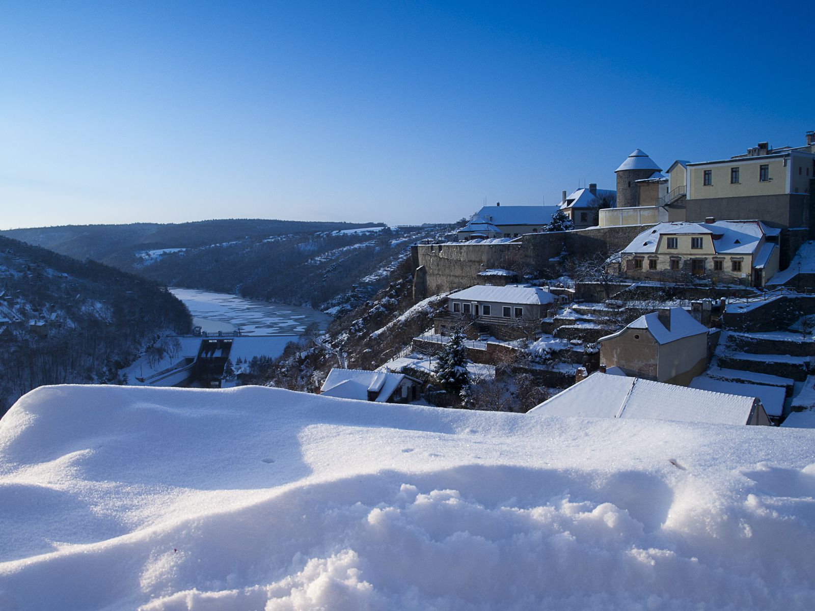 Z Příbrami vyjíždíme netradičně na čtyřech kolech do prosluněného mrazivého rána. Mám trochu obavy ze silnic na Vysočině, takže si necháváme časovou rezervu. Avšak po čtvrteční sněhové kalamitě se situace celkem stabilizovala a hlavní tahy jsou bez problémů sjízdné, dálnice naprosto v pohodě. U Náměšti sjíždíme z D1 na silnici II/399. Na sjezdu stojí cisterna a policejní vůz s puštěnými majáky. Obával jsem se, že silnice bude uzavřena, ale nic se nedělo. Policisté na nás mávají, abychom jeli. Jedeme. Silnice je zasněžená, ale v pohodě sjízdná a sněhu méně, než v Příbrami. Jedeme pomalu a koukáme kolem sebe. Do Dalešic přijíždíme s desetiminutovou rezervou.