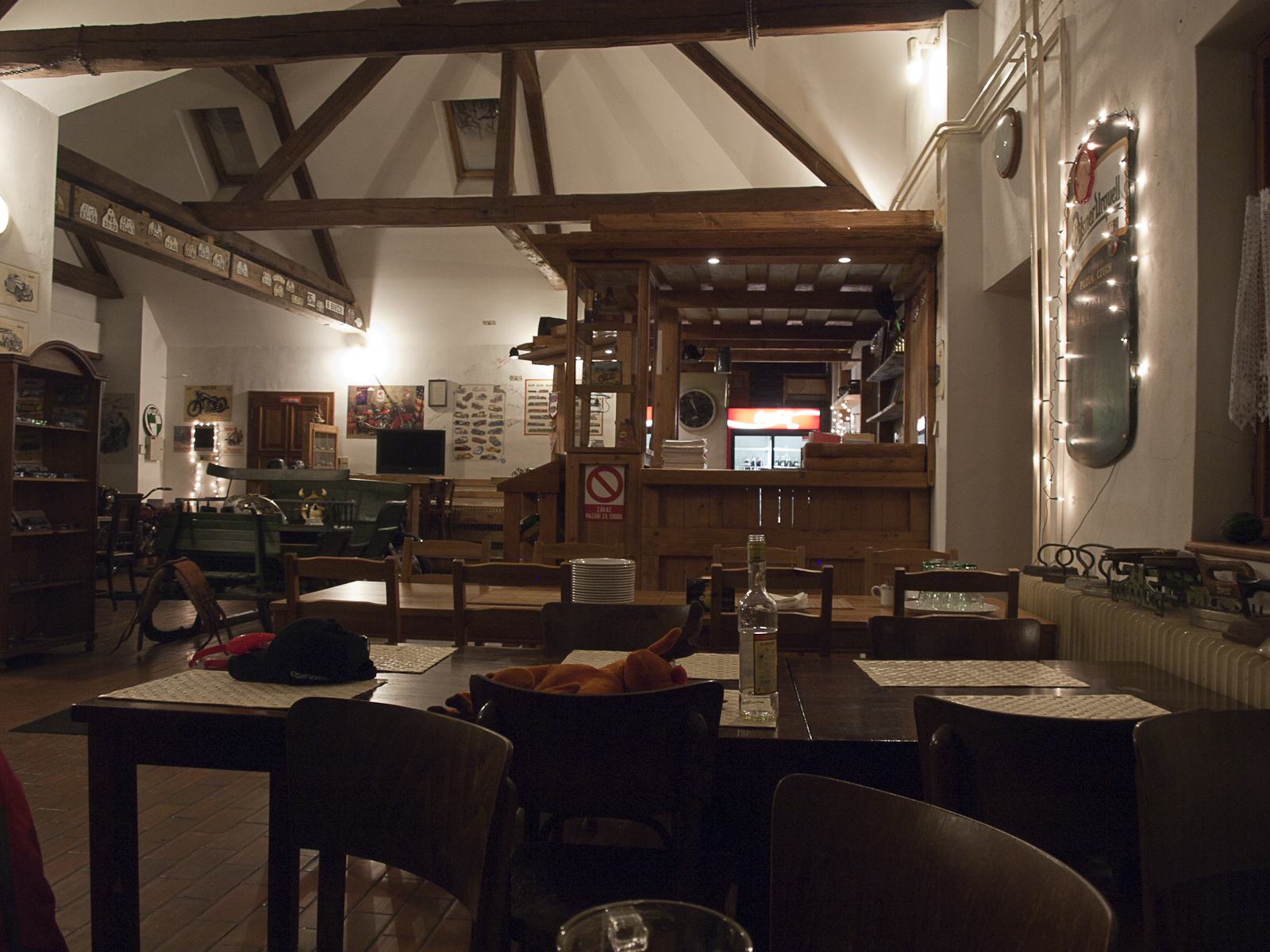 Po večeří se vracíme zpět do našeho útulně prochladlého výčepu. Ústřední topení z úsporných důvodů vypnuté a malá kamínka nemají šanci ten prostor vytopit. Raději než pivo si dáváme svařáky a hned je to lepší. Vlado objevuje, že jsme již zpátky z večeře a nahání do výčepu ostatní. Majitel pouští na televizi DVD s průběhem rekostrukce statku a muzea. To však nikoho nezaujalo a proto se zhrzeně odsunuje za výčep. Večer plyne v družné zábavě a na chlad za chvíli nikdo nevzpomene. Dokonce zapomínáme příkládat, takže kamínka téměř vyhasnou. S pozdním večerem nás majitel vyhání. Bereme pár lahváčů na pokoj, kde zábava pokračuje. Loučíme se kolem jedné a míříme do naší studené kobky. Jsme tam dva, postele tři. Pavla rekvíruje druhou přikrývku a já jdu spát v mikině. Nepovažuji se zrovna za citlivku, ale tušit tohle, vezmu si s sebou spacák.