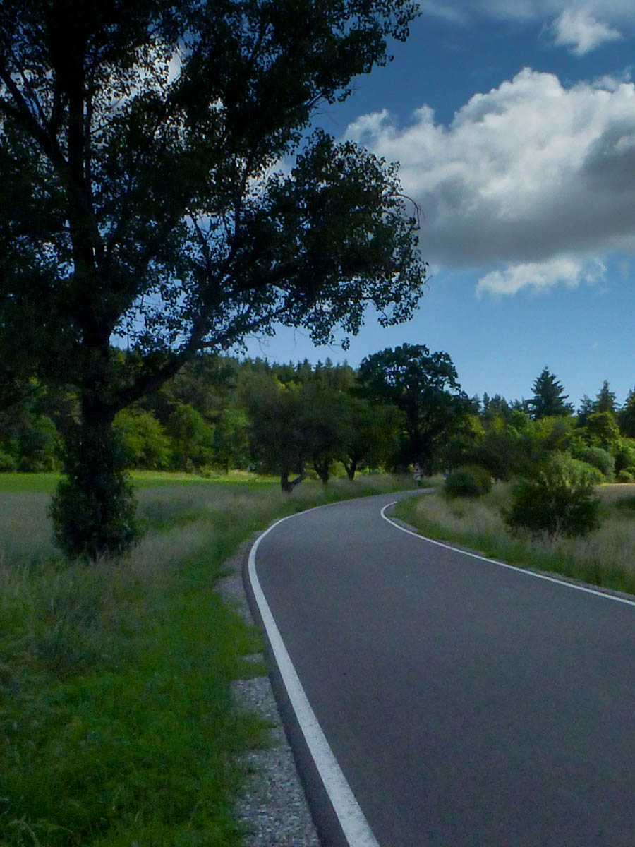 Následující úsek patří mezi mé oblíbené. U Zdíkovce bych to nejraději otočil doprava, dál na Vimperk nebo Kvildu. Ale tolik času nemám. Ale i na Vacov nabízí silnice krásné svezení. A je tak krásně. Za Česticemi mi kazí náladu cedule s objížďkou. Sakra! Zapomněl jsem na opravu mostu u Nihošovic! Ale tu se ve mně probouzí touha zkusit něco nového. Kruhák nabízí hned dvě možnosti a obě s krásným, novým asfaltem! Beru první variantu směrem na Radkovice a čekám, že asfalt skončí v první dědině. A taky že jo. No co, do Strakonic je to podle cedule 10 km, to přetrpím. Ale za dědinou zase nový asfalt! No to je super! Jakási trojka na Šumavě a taková paráda. Pluji si letním ránem a připadám si jak v Rakousku. Asi někde vyhrabali mistra asfaltéra, který umí i zatáčky. Pěkné svezení, až do Strakonic. Dál už to znám, nečekám komplikace. Ve Strakonicích mě předjíždí blikající policejní dodávka. Přemýšlím, kam asi takhle po ránu, když na výjezdu z Domanic stojí i blikající sanitka. Nevím, co se stalo, protože u krajnice stojí felda s vozíkem a na silnici je na šrot enduro s hliníkovými kufry.