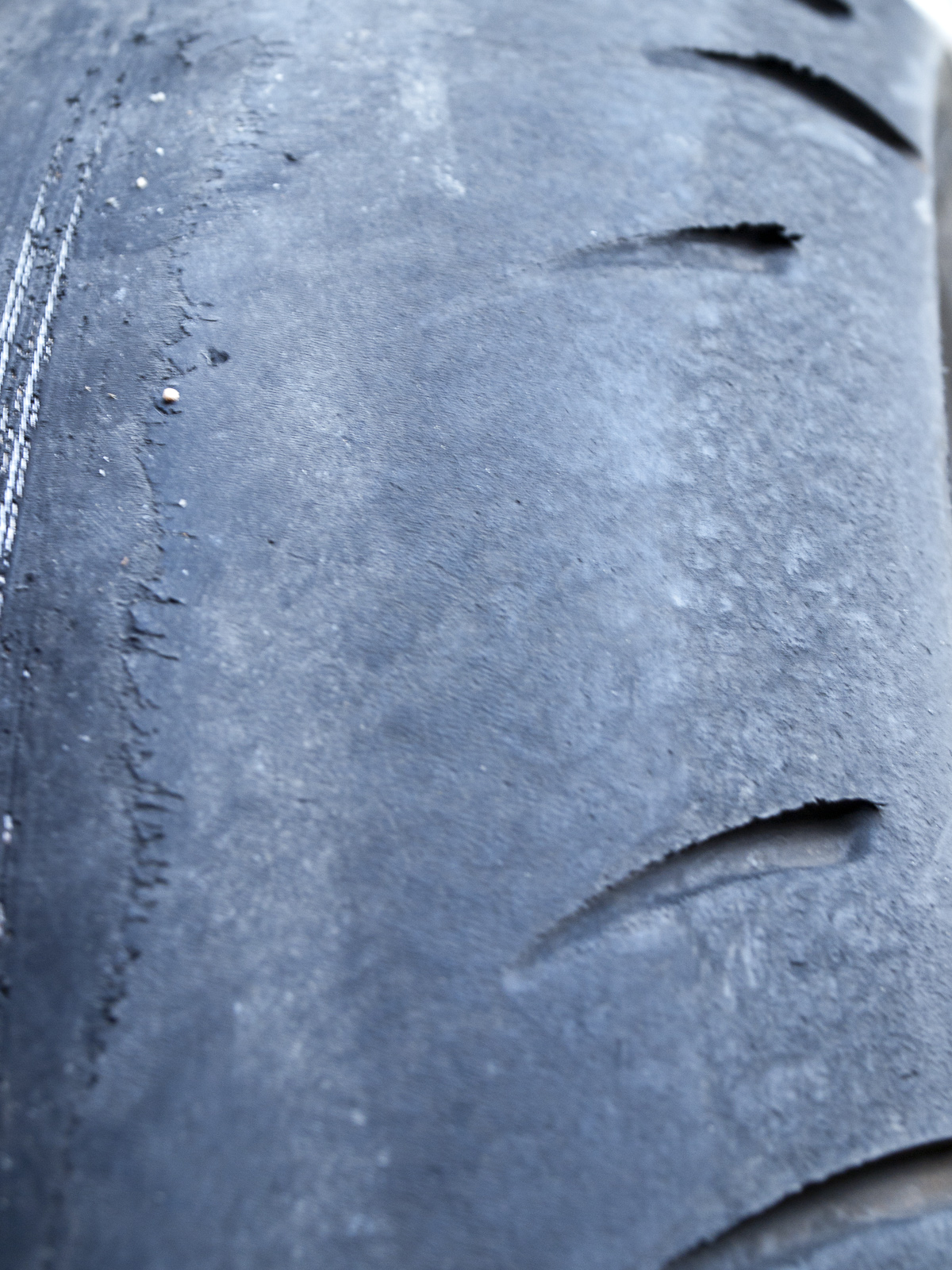 O přezutí na novou gumu je dobré uvažovat už v okamžiku, kdy se vzorek dostane pod předpisovou hloubku. Když zmizí úplně, je již nejvyšší čas. Do drátů zbývalo jen 200km ve dvou.
