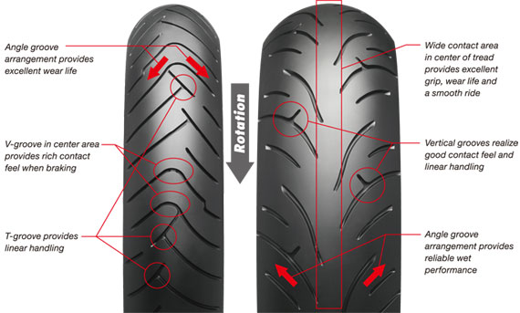 Výrobce zřejmě zapracoval na složení směsi, jelikož jízdní vlastnosti nejsou o nic horší, než u BT021, zatímco životnost se prodloužila. V zatáčkách drží až na stupačku, motorka se s nimi nevlní. Dostatečnou jistotu poskytují i na mokru nebo za chladného počasí a to po celou dobu životnosti.