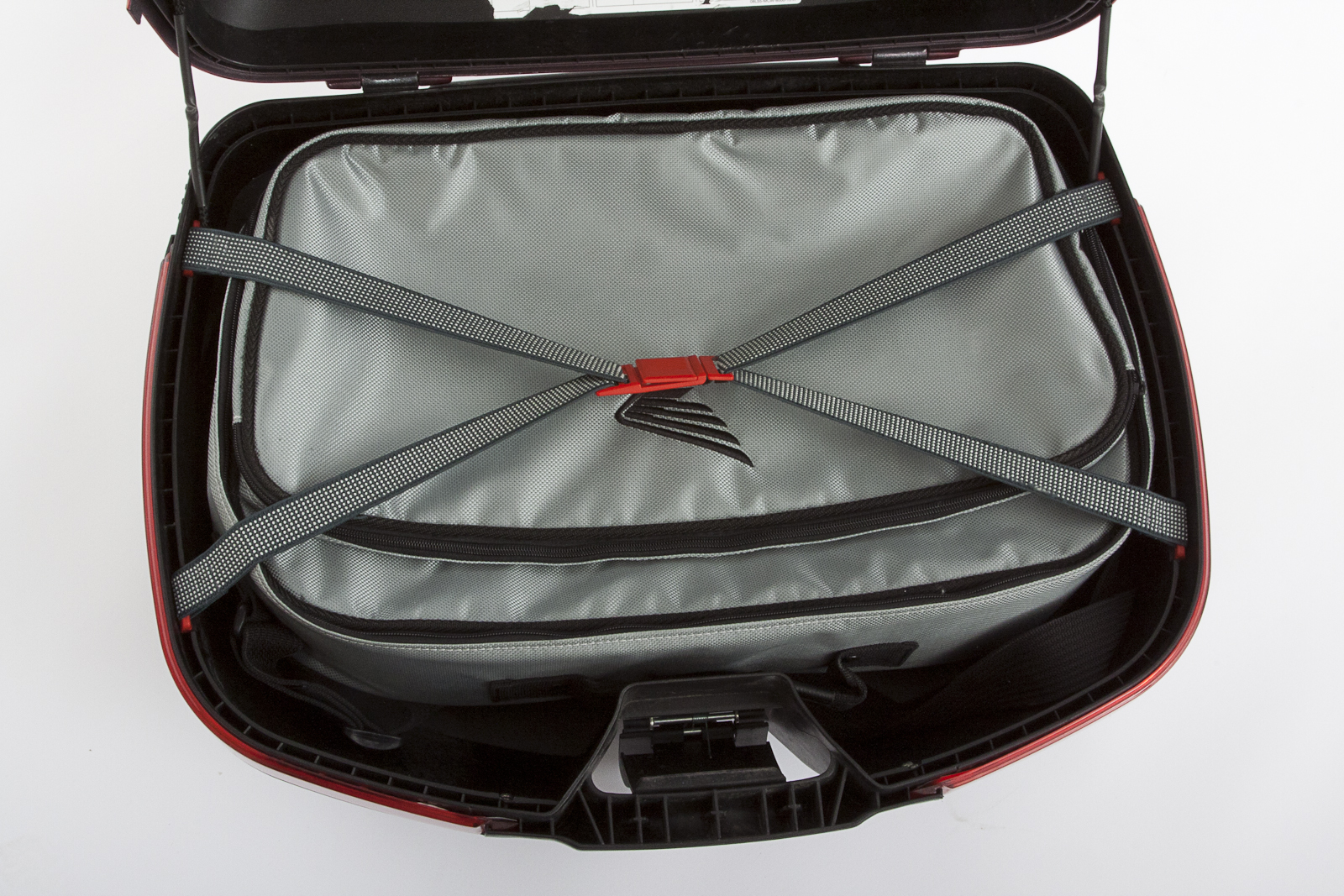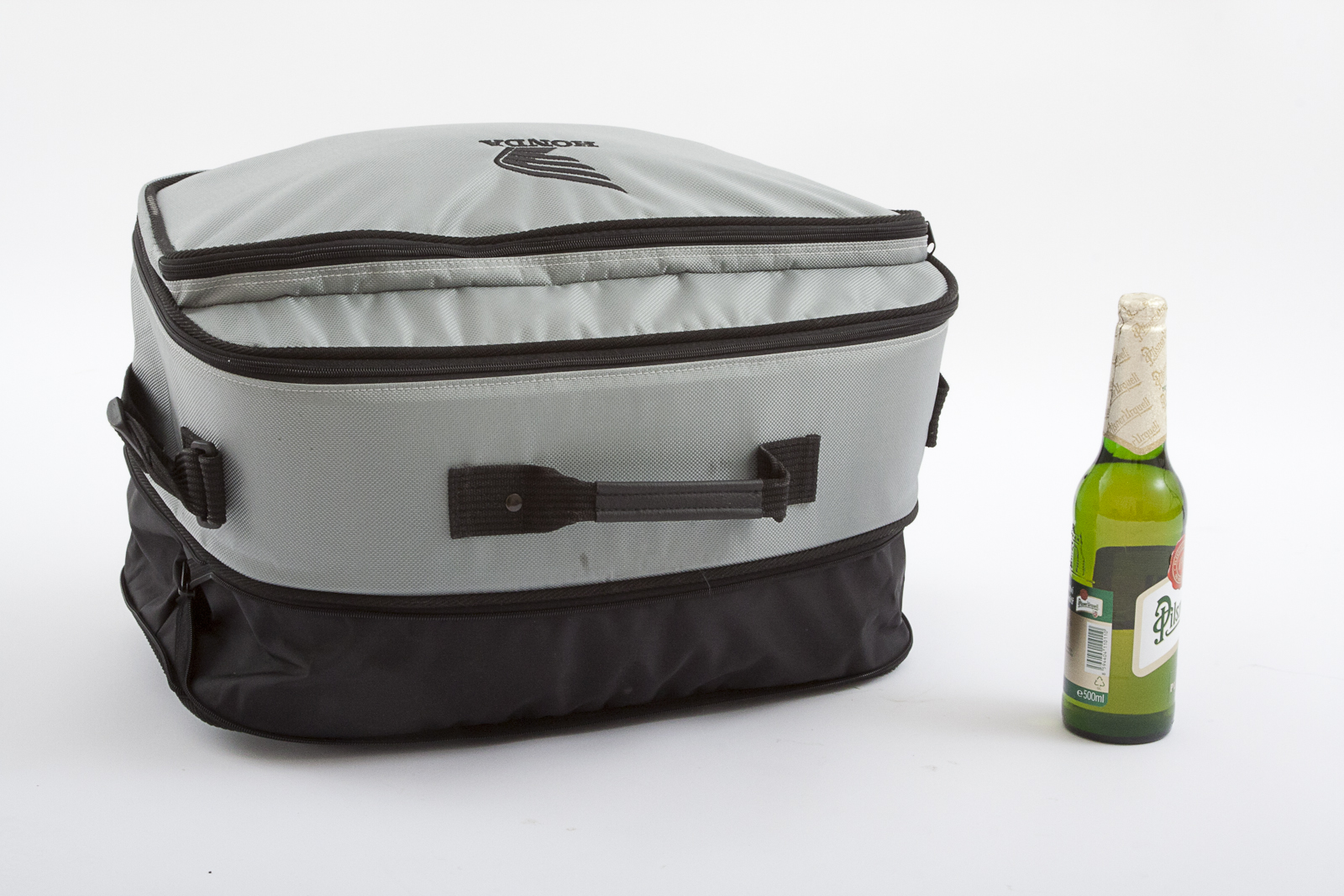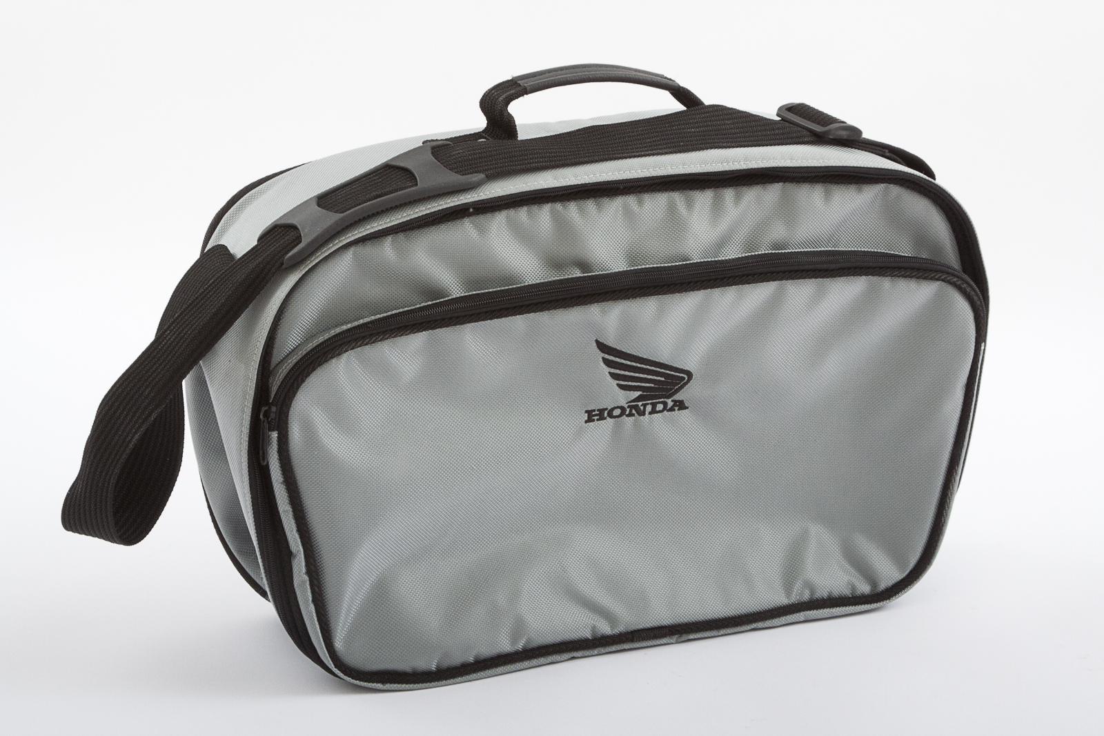 Jako další příslušenství lze přikoupit vnitřní tašku. Tu jsem dokoupil až dodatečně. Dlouho jsem váhal, protože její cena není zrovna lidová, ale v době zimních abstinenčních příznaků, které navíc Honda podpořila slevou na příslušenství a náhradní díly, jsem neodolal. Vnitřní taška má variabilní objem. Menší objem zabere spodní polovinu kurfu, po rozepnutí obvodového zipu zabere kufr celý. Taška se obzvláště hodí, cesty. Buď dáte batůžkovi tašku se slovy „tohle je tvoje, dej si tam co chceš, na víc nemáš nárok“ nebo stejná slova adresujete sobě. Pochopitelně, s textilní taškou přes rameno se mnohem lépe chodí, než s lakovaným plastovým kufrem v ruce. Navíc nemusíte řešit, že ho někde škrábnete.