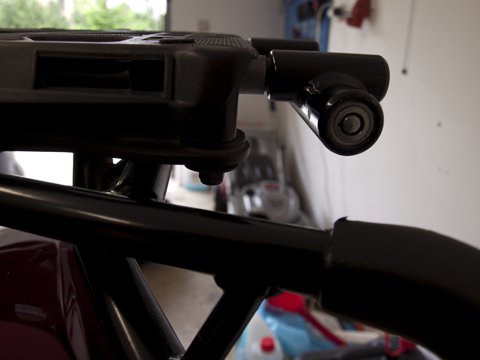 Kufry se k motocyklu přichytí zamykacím mechanismem v horní části. Ten je ovládán výklopným madlem. Dolní trubka slouží jen k tomu, aby zabránila kývání kufrů do stran. Žádnou zátěž nenesou.