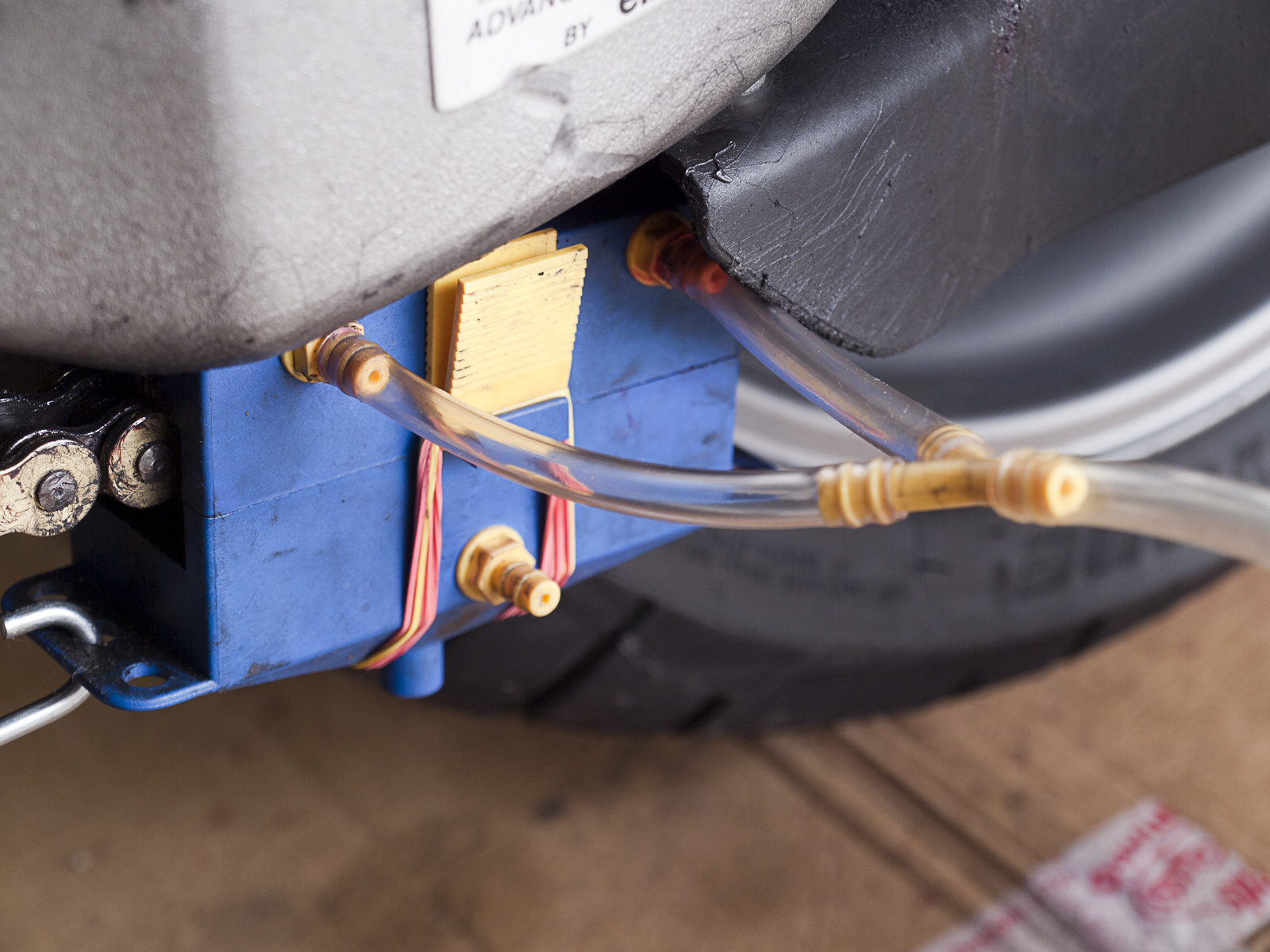 Při vlastním čistění se vaničky nasadí na řetěz, spojí gumovým O-kroužkem a provázkem s kovovým háčkem zafixují o stojan. Pochopitelně, ideální je hlavní stojan. Stačí napojit hadičku s odmašťovačem a otáčet zadním kolem. Kartáčky sice účinně naruší vrstvu vazelíny s prachem, odmašťovač ji rozpustí, ale zcela neodstraní. Ale stačí protáhnout řetěz hadrem a svítí jako nový. Oproti klasickému postupu se celé čištění se nesmírně zrychlí. Stačí párkrát zatočit kolem a je hotovo. Přípravek lze použít i k mazání řetězu, kde opět dochází k mazání válečků a kroužků, zatímco znečištění boků řetězu mazivem je minimální. Mazivo stéká přímo na řetěz, takže není zašplíchané vše okolo. Kartáčky se časem opotřebí, ale lze koupit náhradní. Mezi náhradními díly jsem však nenašel gumový O-kroužek. Součástí balení je sice jeden náhradní, ale je to guma a stárne, takže ten náhradní příliš nepřežije ten původně použitý.