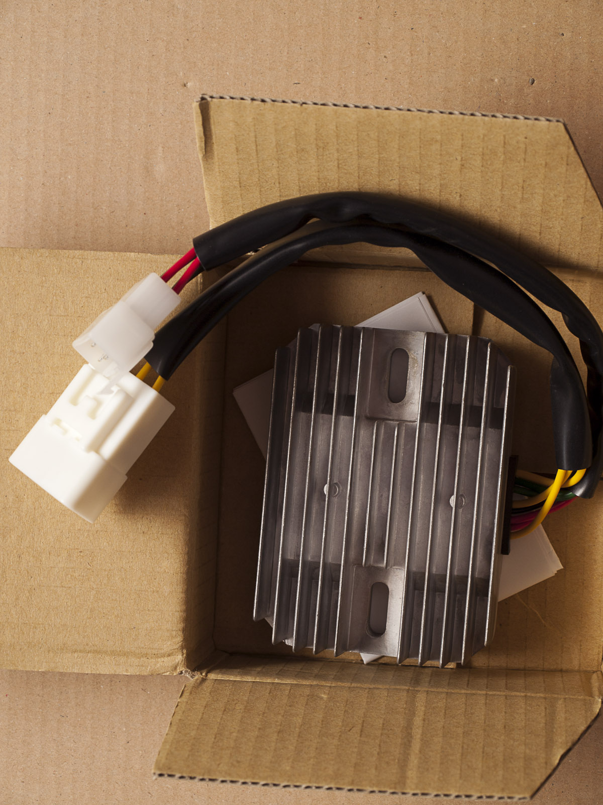 - Zapojte konektory. V tomto bodě jen zmiňuji, že pokud zapomenete nebo špatně nacvaknete konektor od alternátoru (tři žluté dráty), nic se neděje. Když to samé uděláte s konektorem, propojujícím regulátor s akumulátorem (dva červené, dva zelené, černý) a nastartujete, regulátor odrovnáte.