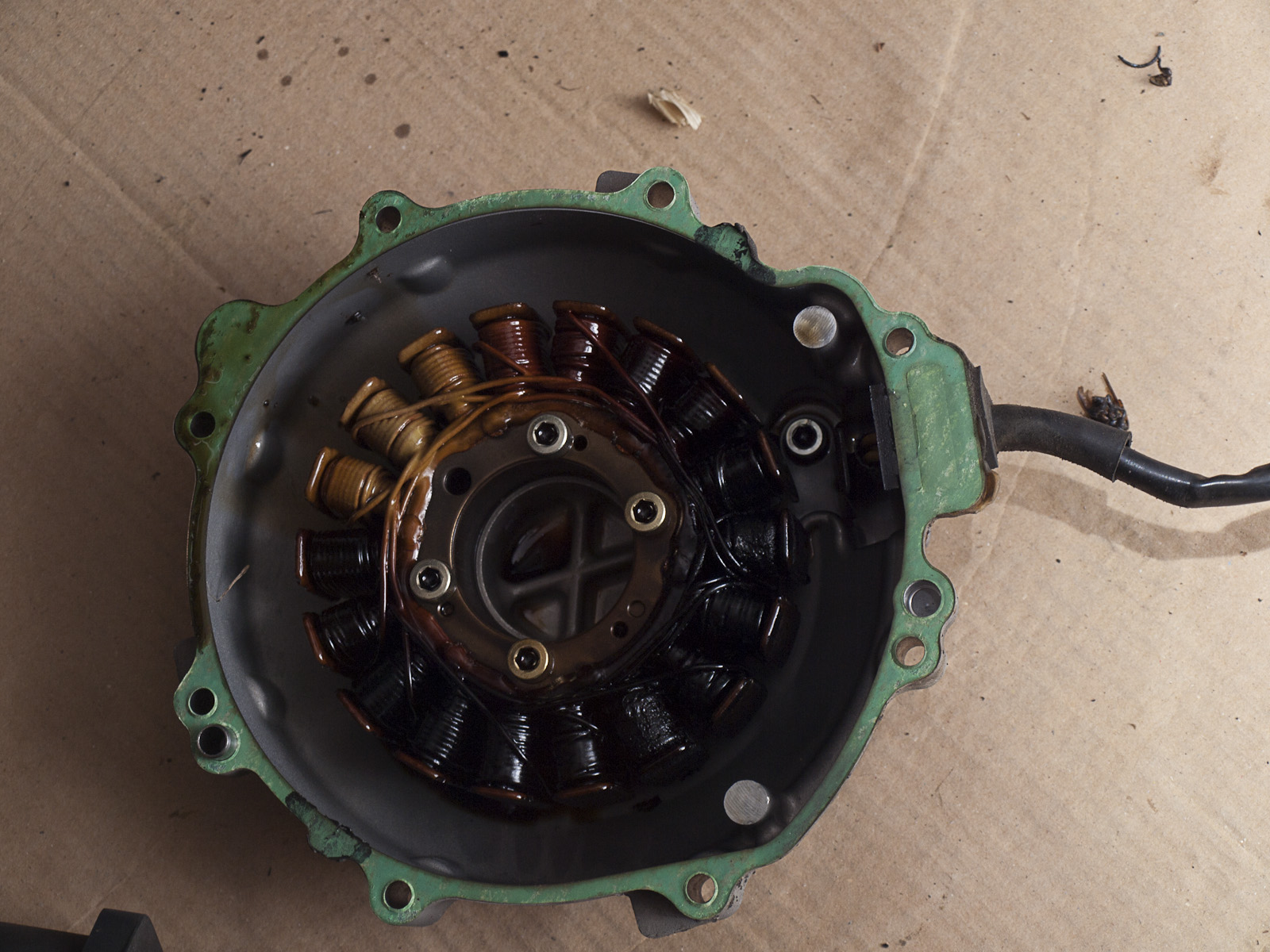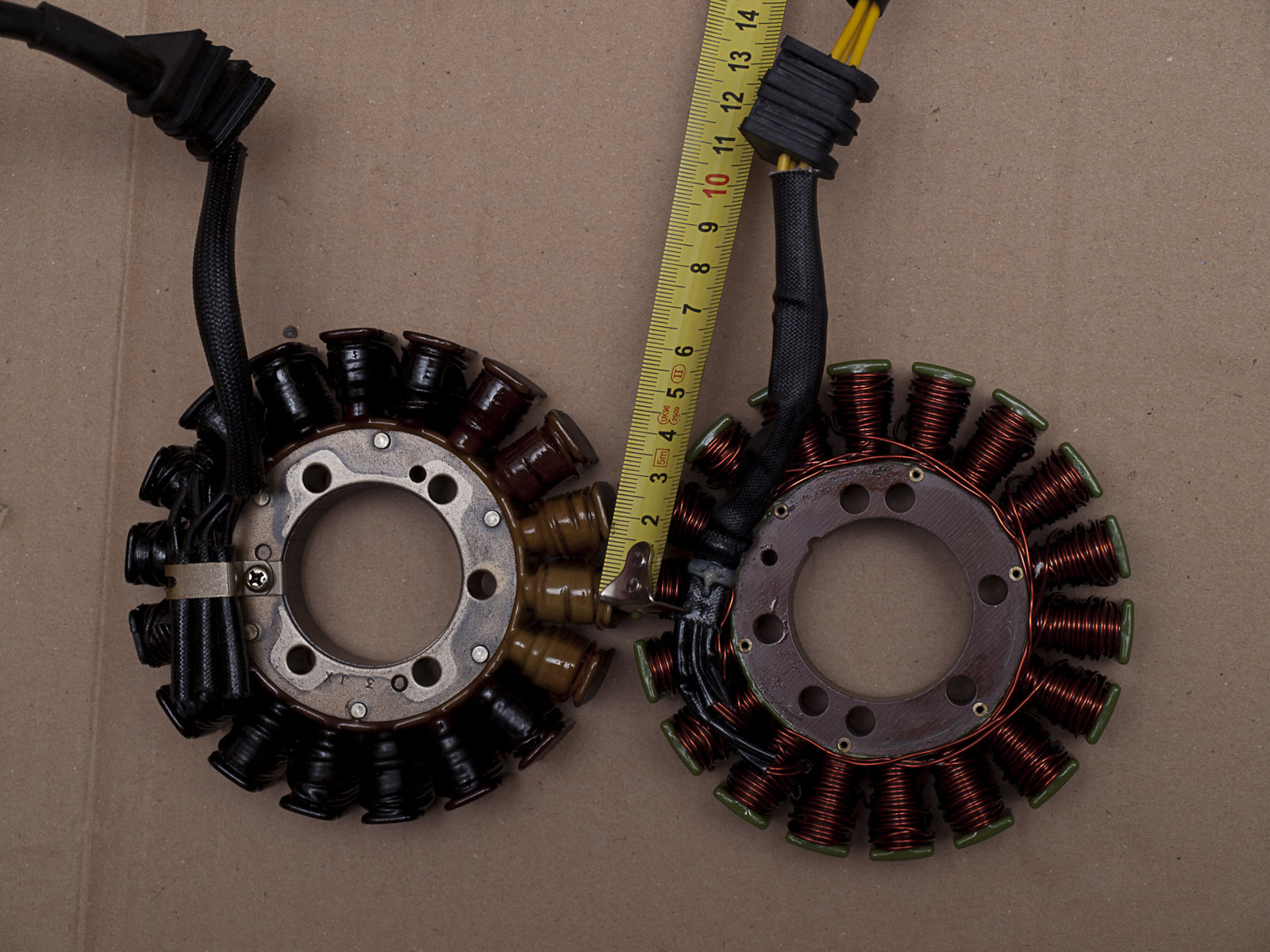 - Namontujte nový stator. V případě nového nebo převinutého dílu by mělo být vše bez problému. U aftermarketové náhrady Electrex jsem měl probém s délkou přívodního kabelu. Konzultací s prodejcem jsem se pokusil posunout těsnění napájecích kabelů. Šlo to ztuha. Tak ztuha, že mne původně tato možnost ani nenapadla. Měl jsem za to, že těsnění je nalisované. Po této úpravě šel již stator namontovat bez problémů. Šrouby dotáhněte momentem 12Nm. Já jsem na závit ještě pro jistotu aplikoval závitové lepidlo.