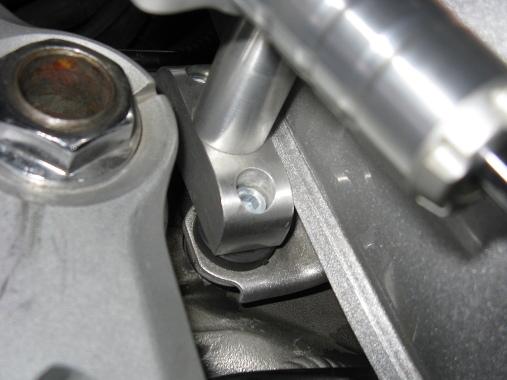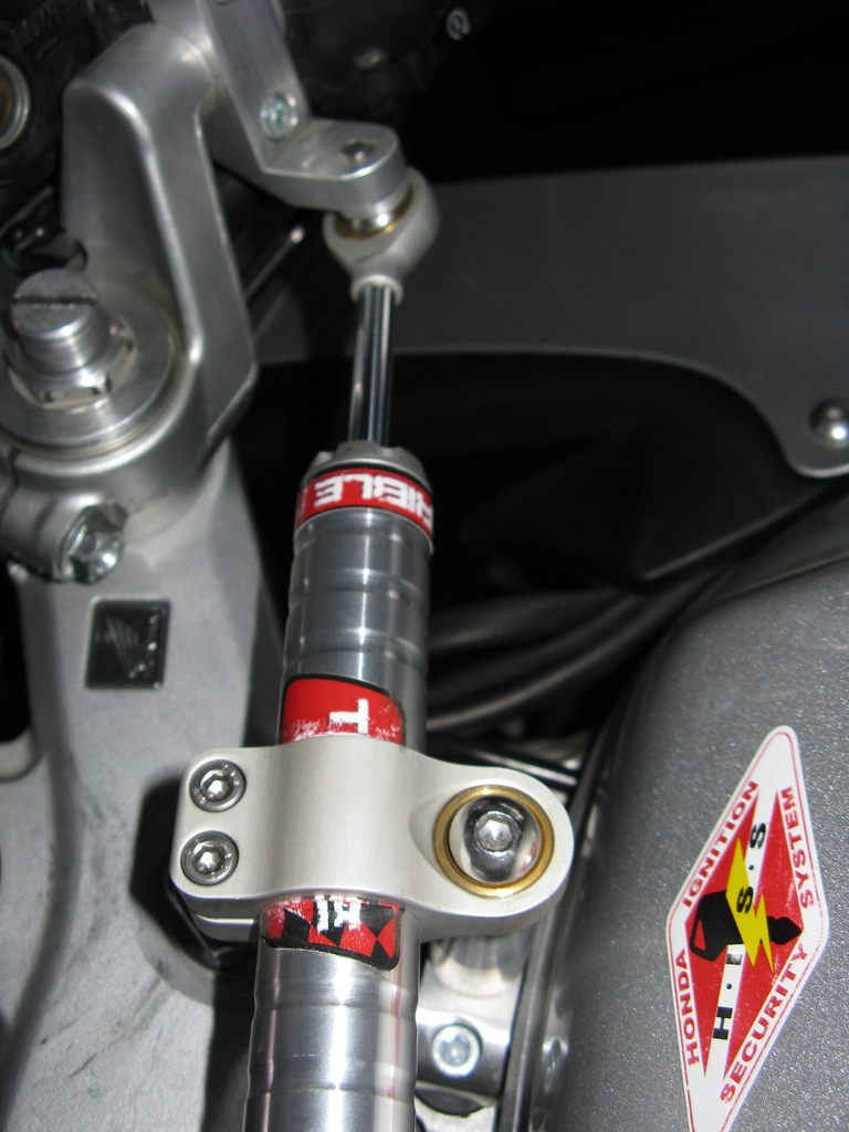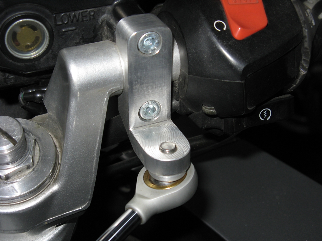 Držák tlumící jednotky se skládá ze dvou částí. Ty se vyvíjejí pro každý typ motocyklu individuálně. První část drží tlumící jednotku přes kloubek pevně k rámu motocyklu. Na VFR800 je umístěn před nádrží prostřednictvím nových, delších šroubů do původních montážních bodů sloužících k upevnění nádrže Druhá část naopak pevně drží, opět přes kloubek umožňující otáčení, tyčku tlumící jednotky k řidítku. Zde konkrétně nahrazením objímky držící nádržku brzdové kapaliny. Jak je vidět, montáží tlumiče nijak nezasahujete do konstrukce motorky. Vše je vratné do původního stavu.