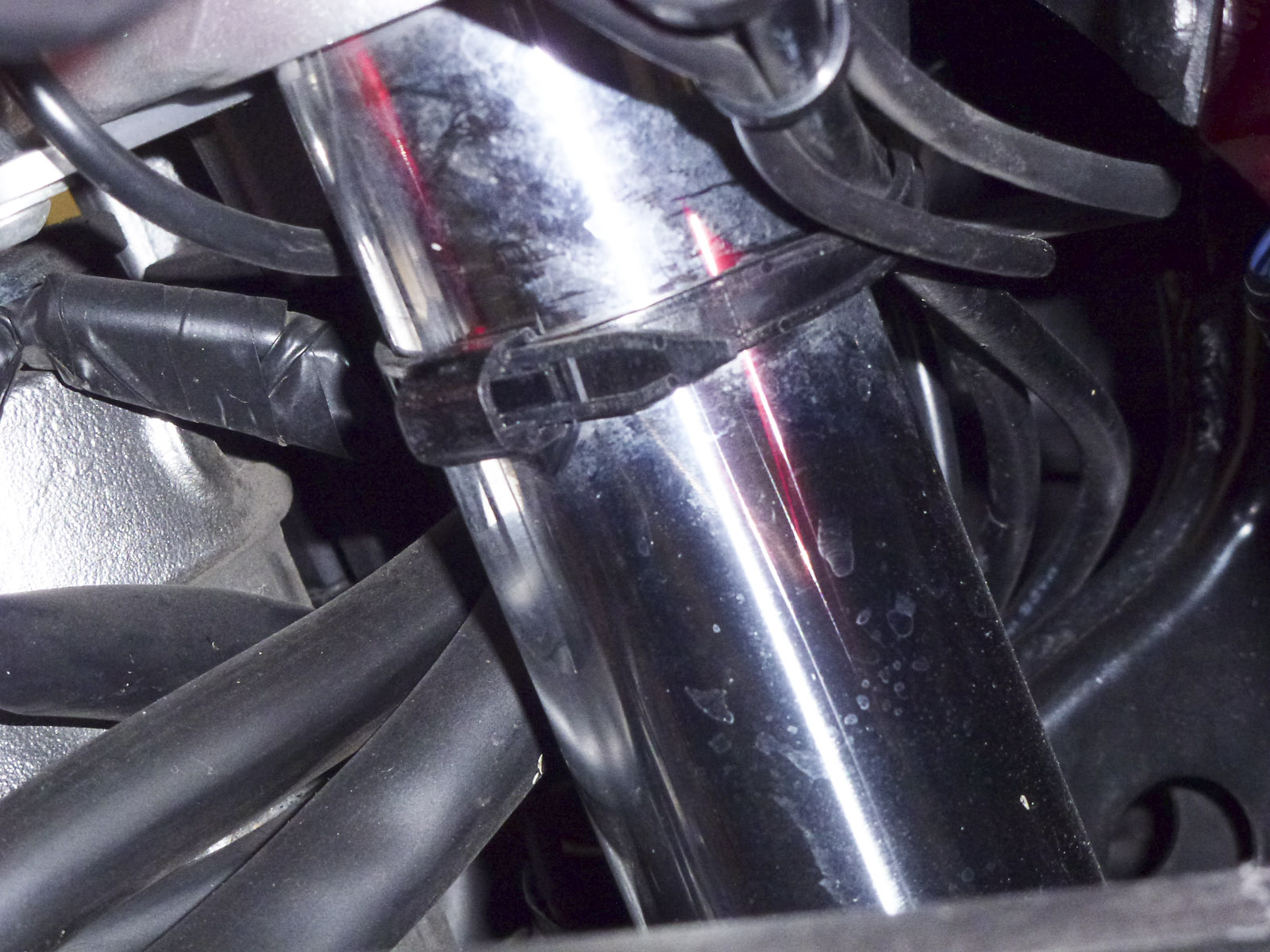 Prostrčte tlumič spodními a horními brýlemi. Pak přidržujte tlumič jen shora a spusťte jej tak, aby jste nasadili řidítko. Tlumič zajistěte pojistným kroužkem. Šuplerou odměřte vzdálenost mezi tlumičem a řidítkem. Honda předepisuje 41mm. Zajistěte tlumič proti posunu na horních brýlích. Utáhněte spodní a horní brýle předepsaným momentem.