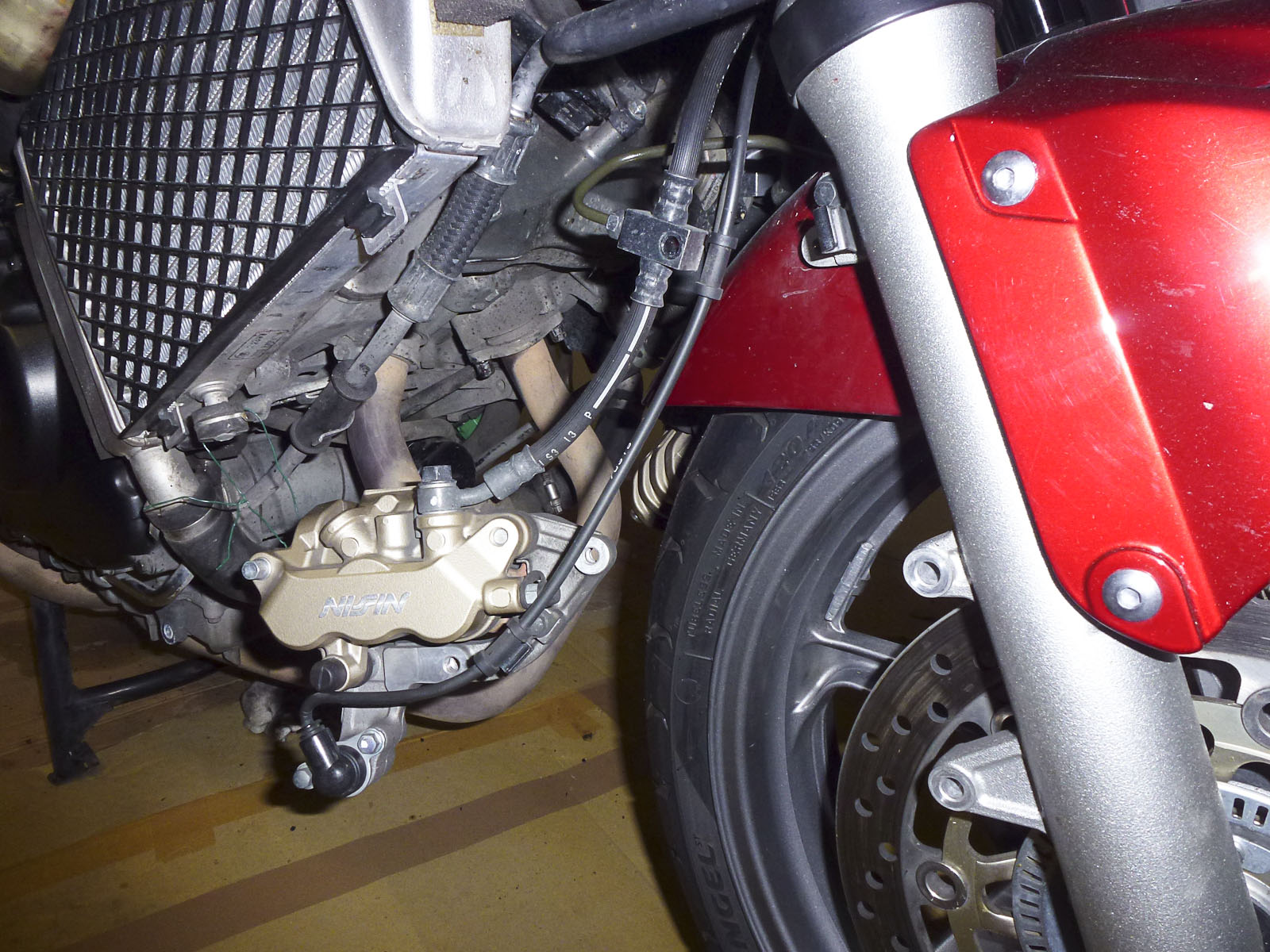Hoďte motorku na hlavní stojan a demontujte přední kolo. Vzhledem k tomu, že vidle půjdou dolů, nelze použít fintu s brzdovými třmeny namontovanými opačně. Ale to nevadí, třmeny se dají pověsit na držáky chladičů, takže nepřekáží, ani nevisí na hadicích.