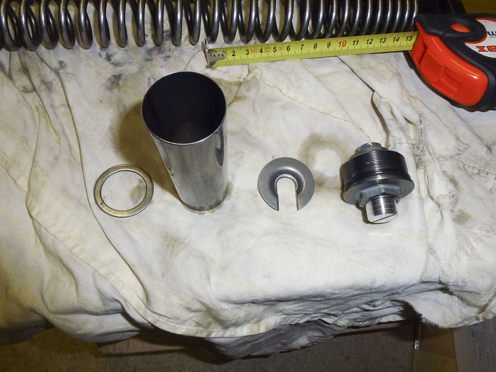 Vytáhněte píst co nejvíce ven. Vložte do tlumiče pružinu (těmi hustšími závity dolů), nasuňte podložku, vymezovací trubici a vykrojenou podložku. Našroubujte víčko tlumiče a dotáhněte kontra matice č. 14. Vytáhněte horní trubku tlumiče do horní polohy a za současného tlaku chytněte víčko tlumiče na závit. Následně již utáhněte klíčem. Dotahuje se poměrně lehce momentem 24Nm.