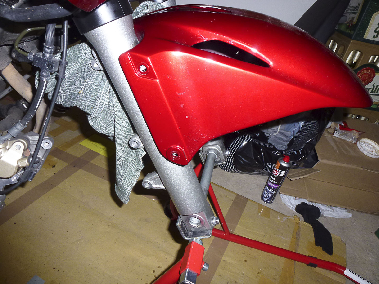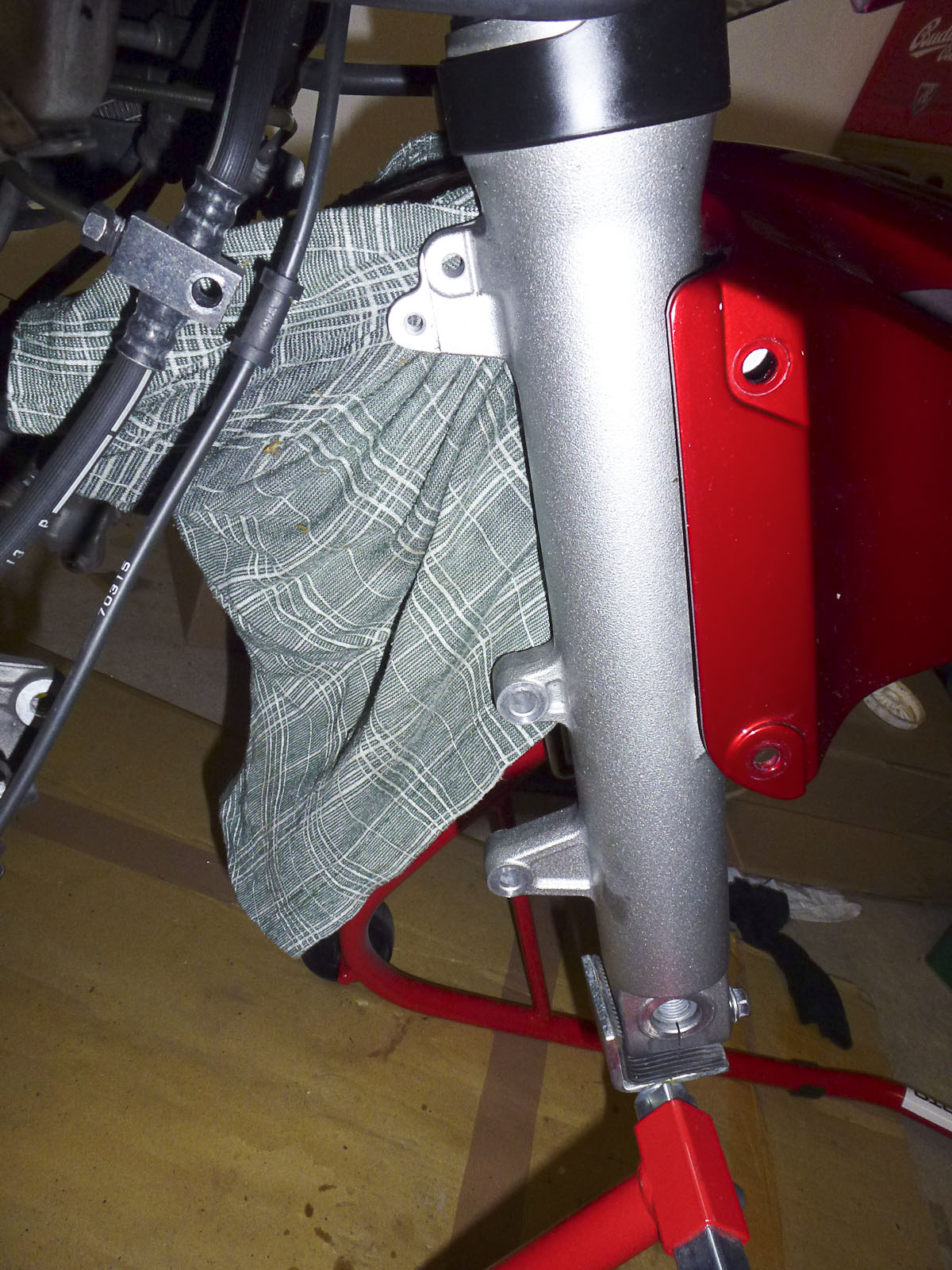 Kapitolou samou o sobě je demontáž/montáž blatníku. Všude se jen píše, povolte šrouby a demontujte blatník. Ale jak? On je totiž na těch vidlích dost natěsno a vytáhnout směrem dopředu znamená téměř jistotu poškrábání. Nahoru to nejde a dolů také ne. Je fakt, že ty škrábance jsou na místech, kde není téměř vidět. Ale naštve to. Já používám speciální přípravek – kus hadru. Jakmile mám blatník povolený, přehodím přes něj hadr. Při demontáží je to trošku problematičtější, protože následně potřebujete dostat hadr mezi vidlici a blatník. Jakmile je podstrčený, můžete již bez obav blatník potáhnout směrem dopředu. Škrábat budete jen hadr. Při montáži je to jednodušší, i když zase můžete chvíli bojovat s tím, jak dostat hadr ven. To řeším jednoduše tak, že ho roztrhám a zbylé kousky již jdou vytáhnout snadno.