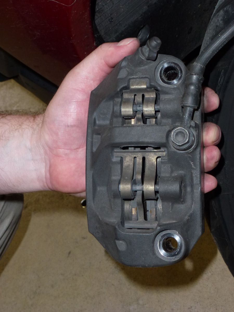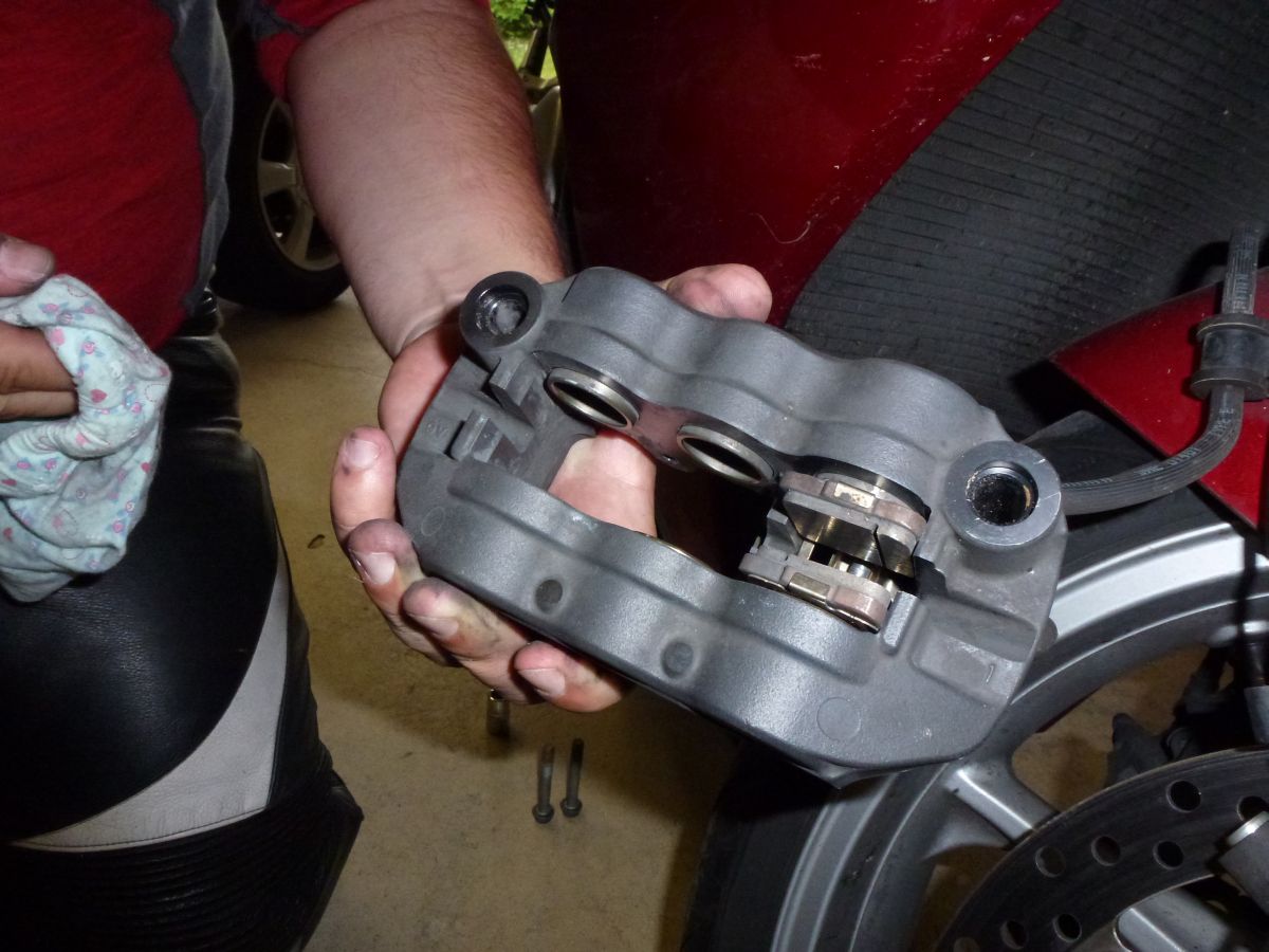 Spodní desky jsou symetrické, nelze je namontovat špatně (pokud je nenamontujete železem ke kotouči). Fotku jsme zapomněli. Třmen vyčistíme, zatlačíme pístky (jde to jen tak rukou) a můžeme skládat.