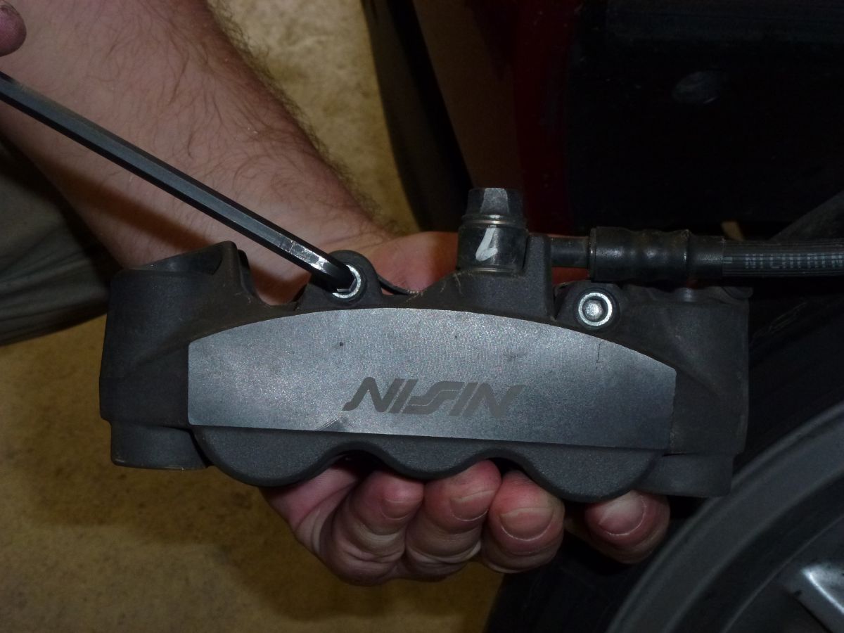 Povolíme šrouby třmenu a vyšroubujeme je ven. Vysuneme třmen směrem dozadu z kotouče. Důležité je zapamatovat si polohu pérka. Ono by ani nemělo jít namontovat jinak, ale jsou různí kreativci a nebo se stačí jen zakecat... takže viz obrázek.