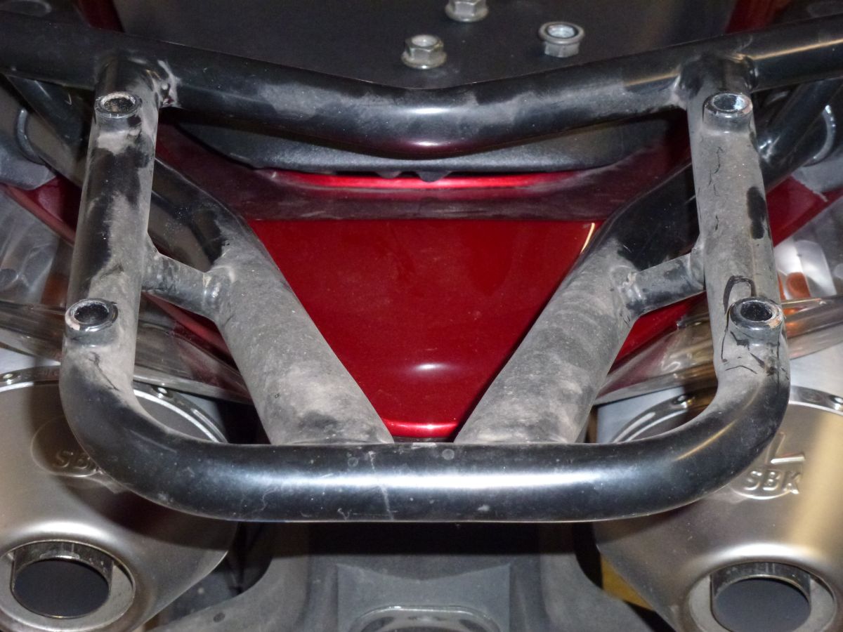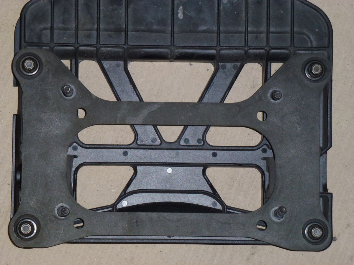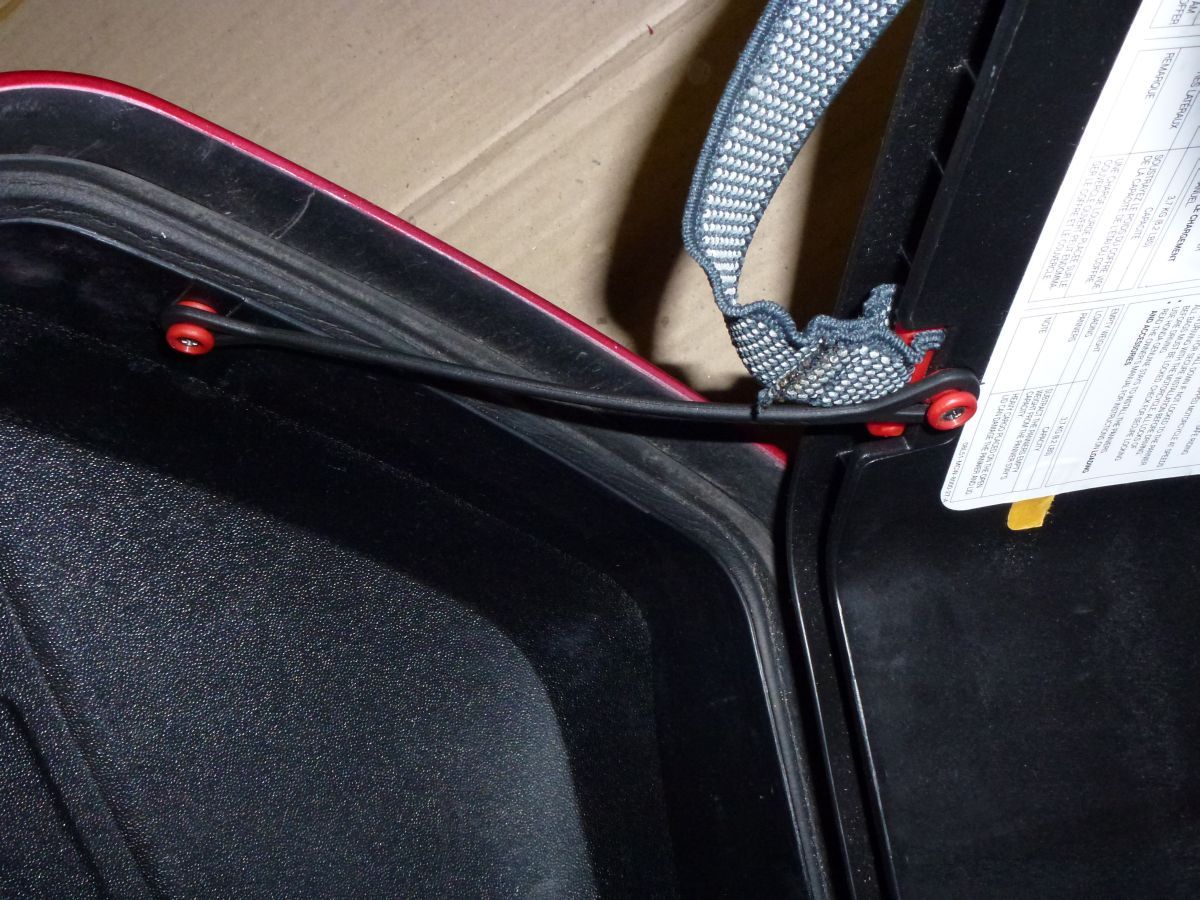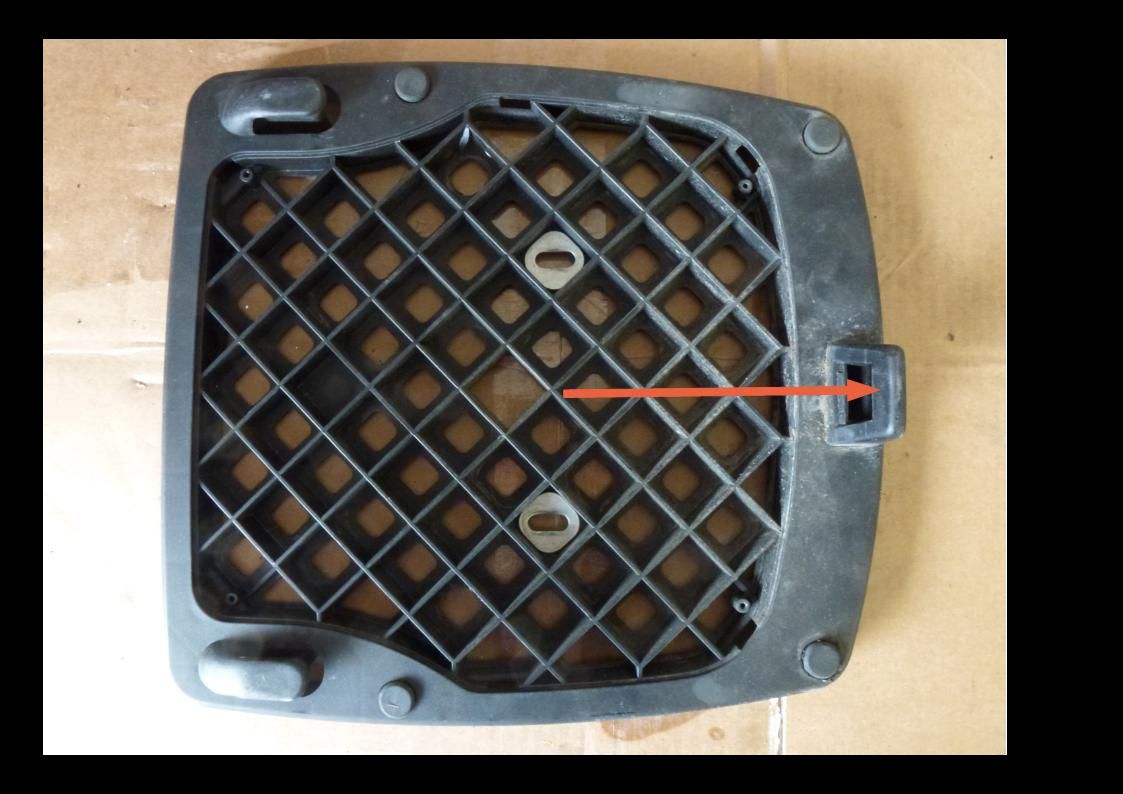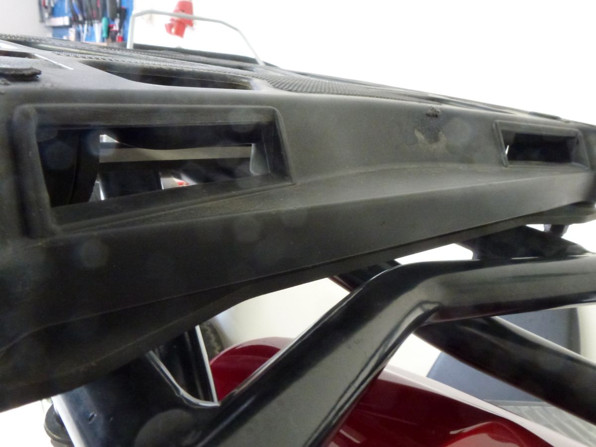 Největším nedostatkem kufru je ale jeho uchycení k plotně. To příliš ve mně důvěry nevzbuzuje. Originální kufr se do plotny nacvakává proti směru jízdy. Na dně má přišroubovaný kovový odlitek, který zapadá do otvorů v přední hraně plotny. Takto uchycení kufr je fixován jak proti horizontálním a vertikálním pohybům. Masivní zub v zadní části kufru funguje jako třetí bod. Zub je také kovový a fixuje zadní část kufru horizontálně, vertikálně a proti posunu vpřed, např. Při brzdění. Proti posunu vzad kufr primárně fixuje výše popsaný nálitek na dně kufru. Pokud jedete se spolujezdcem, pak se může pohodlně o kufr opřít a hlavní zátěž převezme právě ten nálitek.