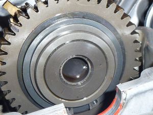 3. Začneme třeba zadní řadou válců. Natočte motor do pozice 3T. Vačky musí být na třetím válci nahoře, podélné rysky na rozovodových kolech na vnějších stranách kol a rovnoběžně s horní hranou hlavy válců. Vůbec není na škodu označit si fixou zuby proti sobě.