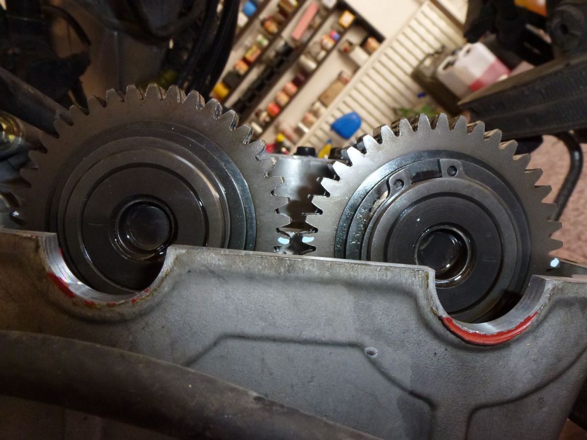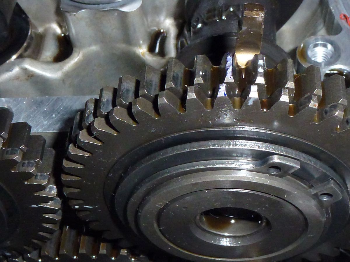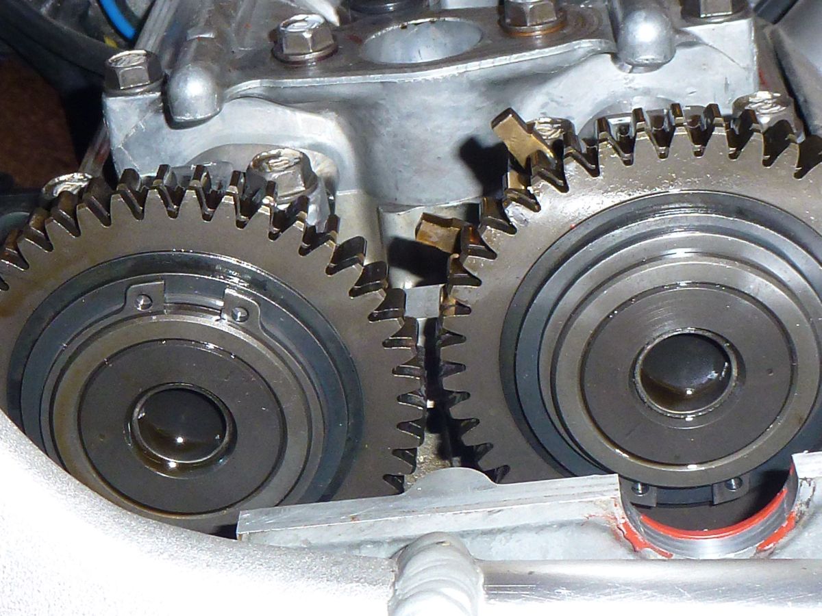 Bohužel, rozvodová kola je kus krásné strojařiny, o kterou jsou následující generace VFR ochuzeny. Jen pro zajímavost dodám, že ačkoli se motor točí ve směru hodinových ručiček, vačky se díky převodu točí opačně, proti směru otáčení motoru a částečně tak ruší gyroskopický efekt motoru. A možná také působí jako vyrovnávací hřídele a tlumí vibrace.