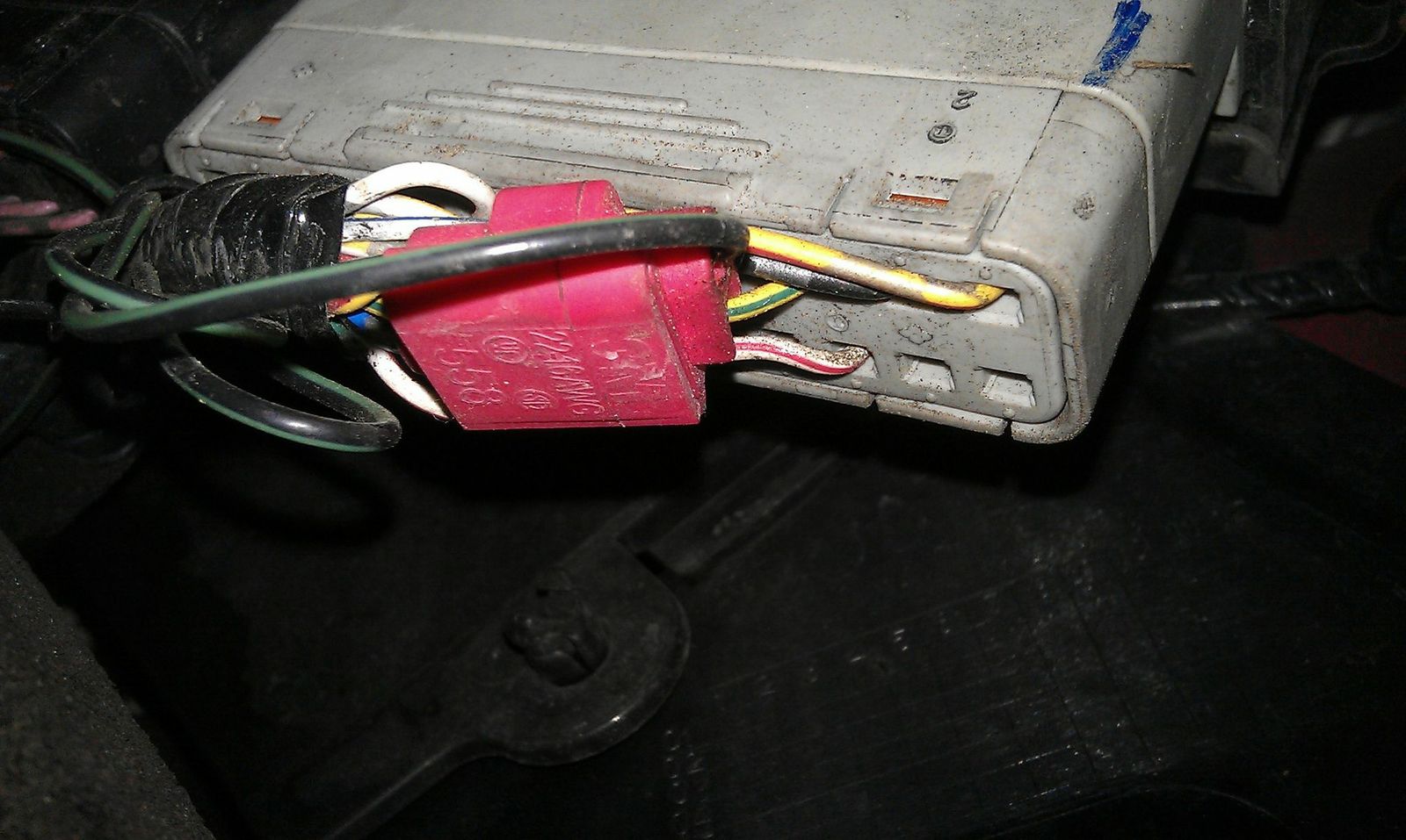 6. Za pomoci pribalenej ružovej svorky, zaklapneme žlto-zelený vodič z vodičom vedúcim z konektora ukazovateľa zaradenej rýchlosti