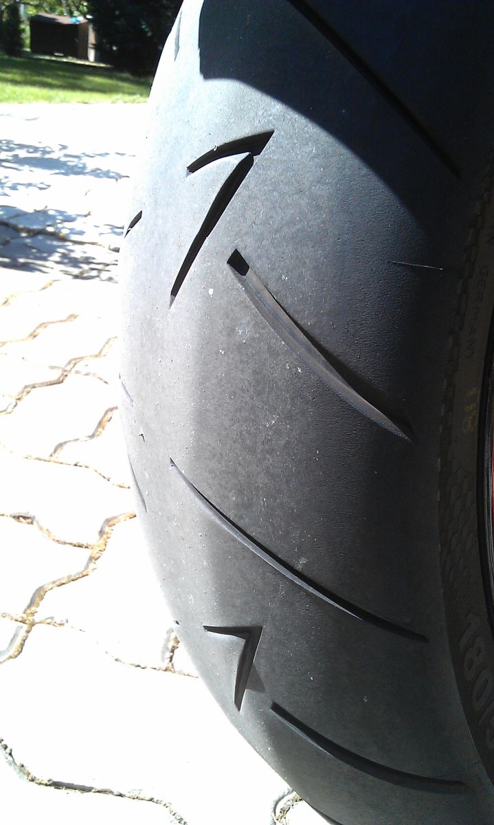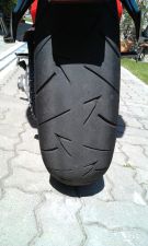 Zatiaľ čo po prvých 3000 km sa mi aj napriek jazde po diaľnici darilo držať oblý tvar pneumatiky, po najazdení ďalšej tisícky už začínalo byť vidno mierne zjazdenú plochu v strede. Aj napriek tomu to nebolo poznať a pneumatika sa správala rovnako perfektne ako zo začiatku. Keďže bývam v oblasti kde takmer vôbec neprší moje skúsenosti z jazdou v daždi sú dosť slabé. Ale jeden výjazd sa nám ,,pošťastilo“ a išli sme asi 100 km v miernom daždi. Na jazdných vlastnostiach to však poznať nebolo a pneumatika držala aj na vode ako prilepená a dokonca som si dovolil aj hlbšie náklony ako keby bolo sucho. Jednoducho perfektné. Tejto pneumatike nevadí ani voda ani chlad, stále sa správa rovnako dobre.