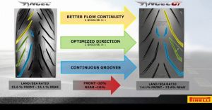 Nový profil gumy umožňuje o 5% větší náklon. Na tom asi něco bude, protože na těchto gumách jsem ztratil levý hlásič náklonu a opiloval si botu. Zadní pneumatika je oproti svému předchůdci dvousměsová - tvrdší střed s nižším obsahem siliky pro větší výdrž a naopak měkčí boky pro lepší grip v náklonu. To je dle mého názoru jednoznačně posun vpřed. Starší model se strašně snadno "zprznil" na rovinkách.