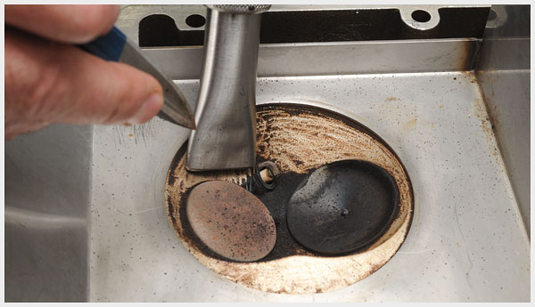 6) Seškrábaní a vážení úsad - Pomocí speciálního přípravku technici seškrábou a odsají karbon z hlavy válců a pístů. Jeho hmotnost se stanovuje zvážením filtru před a po seškrábání.