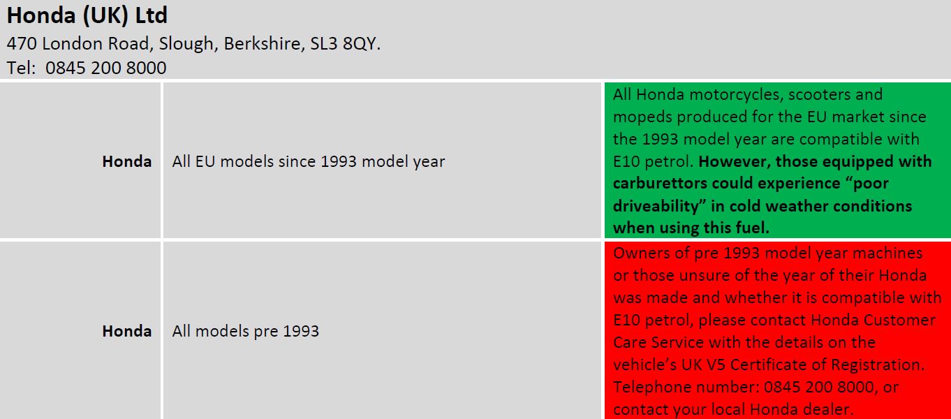 Jak je na tom s kompatibilitou provozu na E10 Honda ilustruje následující obrázek:
