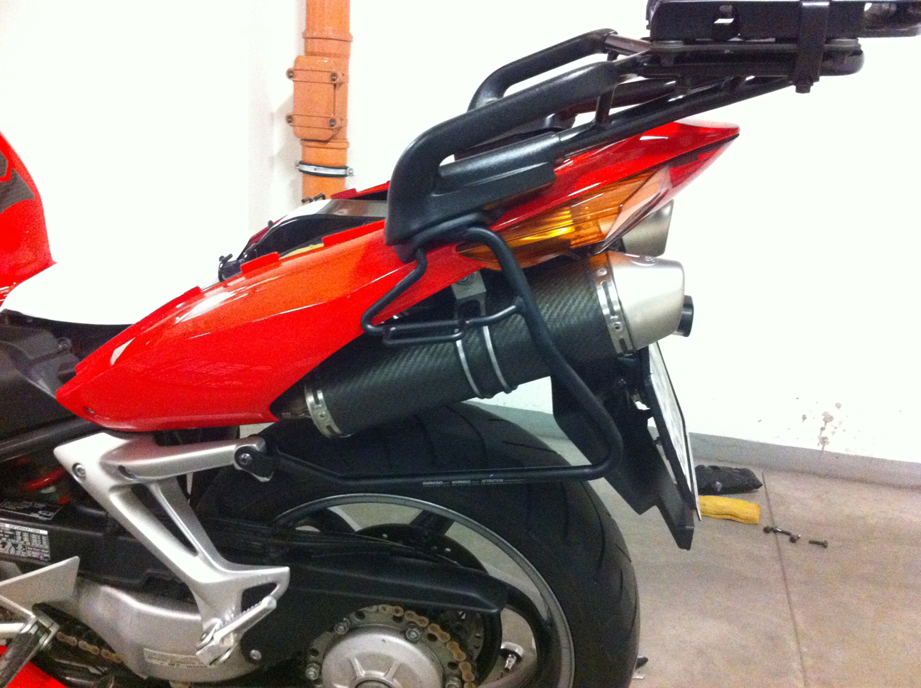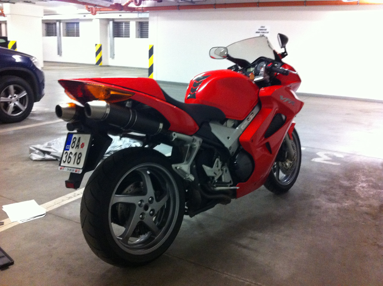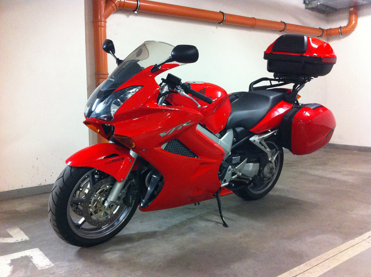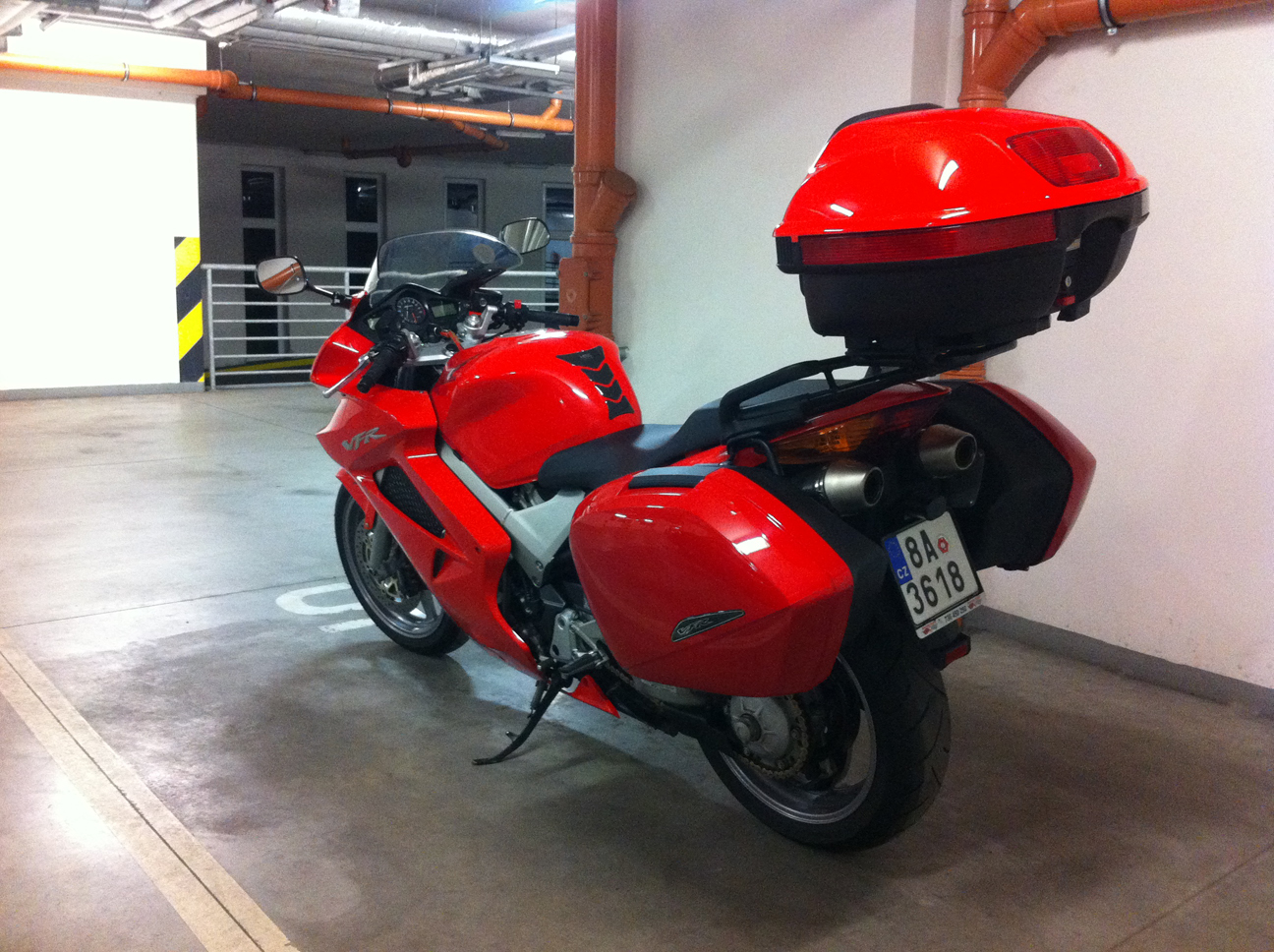 Tak tedy nejprve na úvod - mám Hondu VFR 800 VTEC, model 2005 (oranžové blinkry), který ale šel do provozu až 2006 (to už byly modely s čirými blinkry). Motorku mám od roku 2012 a koupil jsem jí už s originálním top casem. Jelikož jsem motorku kupoval s úmyslem nejen sportovní jízdy, ale i delších cest, tak jsem prakticky od začátku vymýšlel, jak zvětšit její zavazadlový objem. Z předchozí motorky jsem měl sadu textilních brašen, které jsem ale velmi rychle zavrhnul, kromě nutnosti polepit plasty ochrannou fólií jsem zjistil, že na VFRo moc (vůbec) nesedí a výfuky v jejich bezprostřední blízkosti by jim taky nemusely udělat dobře.