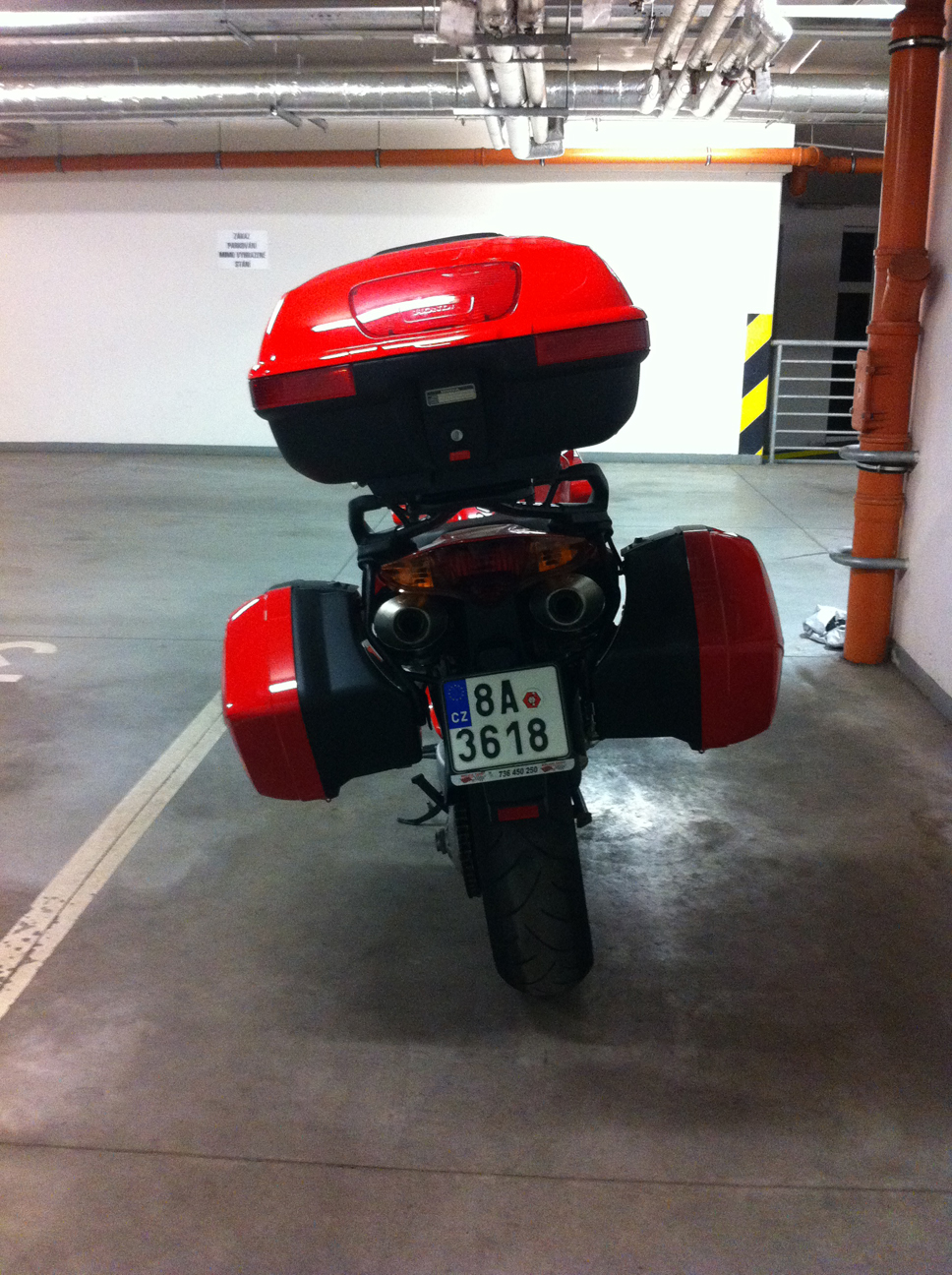 O pár hodin a o pár lahváčů později se dílo zadařilo a já jsem mohl konečně na motorku nahodit všechny kufry. Nutno říct že motorka s nimi vypadá perfektně a na první pohled ani není tolik patrný rozdíl v barvách. Pokud o tom někomu neřeknu, ani neví. Především jsou ale jak držáky, tak kufry perfektně zpracované. Kufry mají na vnitřní straně kovový plát chránící před žárem z výfuku a upěvňují se velmi jednoduše - nejprve se zachytí za spodní hrani držáku a pak se zachytí a zamknou o horní hranu. Vše velmi dobře pasuje a nasazení a sundavání je otázkou vteřiny.