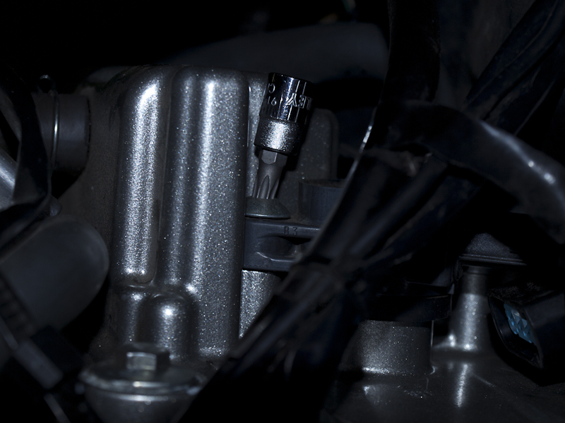 Utáhněte svíčku. To je asi jediný kritický moment celé operace. Rozhodně svíčku nedotahujte velkou silou! Opět hrozí zničení závitu! Pokud máte momentový klíč, dotáhněte momentem 12 Nm. Některé klíče tak jemné nastavení neumožňují. Pokud dotáhnete svíčku momentem 15Nm, nic nezkazíte. Pokud klíč nemáte, dotáhněte svíčky o ½ otáčky pro nové svíčky nebo od 1/8 do ¼ pro svíčky, které jen montujete zpátky. Vzhledem k nedostatku místa se moc nedá použít úhloměr, nehledě, že jej spousta lidí stejně nemá. Když nemám po ruce momentový klíč, dotahuji svíčky ráčnou tak, že ji uchopím za hlavici a tlačím na ráčnu jen hřbetem ruky. Páka je pak tak malá, že i když utahujete na „fest“, neměli by jste nic pokazit. Tohle tvrzení pochopitelně neplatí pro nabušené bouráky z posilovny. Na rozdíl od olejového filtru, nelze volit opatrnický postup a dotáhnout raději méně než více. V případě nedotažené svíčky hrozí její vyklepání v závitu.
