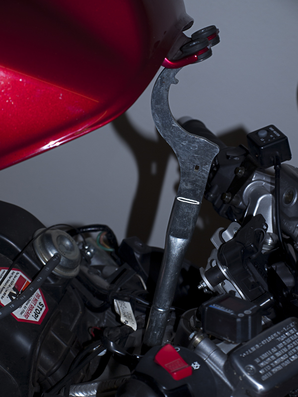 Zvedněte nádrž (pro neznalé, povit dva šroubky s hlavicí č. 10 vpředu), podepřete nádrž C klíčem s prodloužením. Pokud C-klíč nemáte, pak čímkoli, co bude držet.