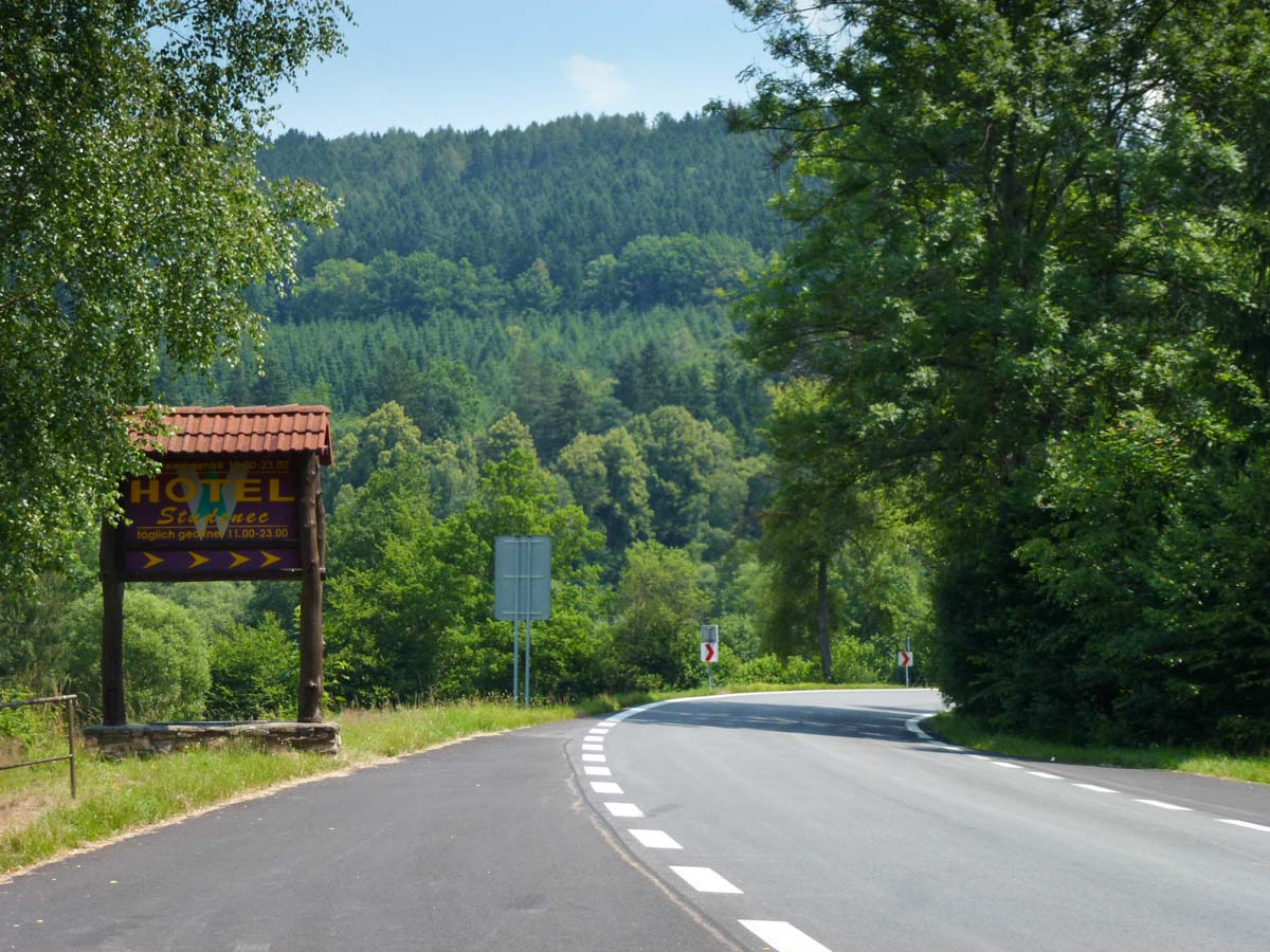 Ve Vyšším Brodě na náměstí odbočíme do kopce na silnici II/161. Kolem vietnamských stánků s trpaslíky, obludnými lesklými baňkami na plot a jinou veteší začneme stoupat do Studánek. Odsud je to 3 km na státní hranici.