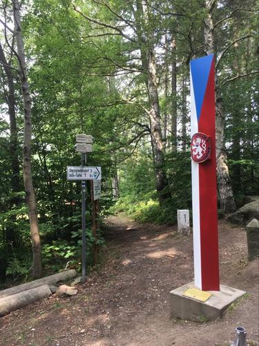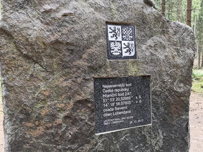 No a teď už jen kličkovat kolem hraničních kamenů po žluté až k cíli dnešního výletu. Bylo krátce před polednem a slunko mělo už sílu. Začínal jsem se se potit, byť jsem ponechal část výstroje v kufru na Vefru. Měl jsem ale štěstí, protože po chvilce mne značení zavedlo na lesní pěšinu, kde teplota byla již snesitelnější. Kdybych měl tuto trasu charakterizovat, tak bych ji označil jako fajn trasu pro rodiny s malými dětmi anebo pro milence, kteří hledají samotu. Pěšinka se vinula kolem malého potůčku a mezi kmeny smrků. Chvilku po české a chvilku po německé straně. Ještě nikdy jsem nebyl během tak krátké doby tak často na návštěvě Německa. Po chvilce putování jsem spatřil cíl mé dnešní cesty – žulový obelisk se vsazenou mramorovou destičkou. Nejsevernější bod naší republiky byl tedy pokořen. Opravdu jsem zde potkal ony dva motorkář. Ze žertu jeden z nich prohodil, jestli je nepronásleduji. Následovalo focení okolí a pochod nazpět k mašině - něco málo přes dva kilometry po stejné trase nazpět. Svítilo slunko, božské ticho a kvetoucí stromy u silnice, to byl balzám na duši. Domu jsem se dostal v pořádku někdy kolem čtvrté odpoledne, nebyl důvod spěchat.