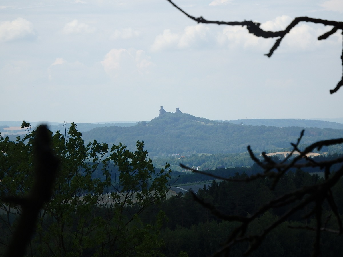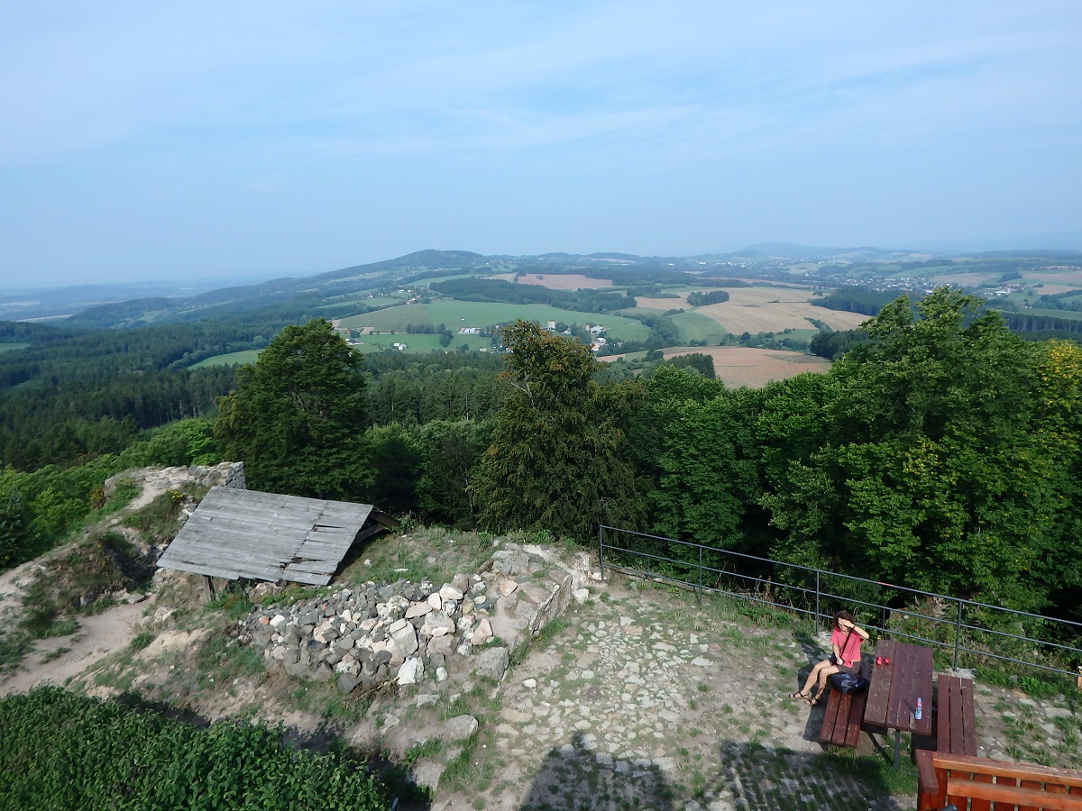 Obědem jsem se tehdy nezdržoval, odbyl se bagetou z benzinky a mohl jsem pokračovat dále v putování. Opustil jsem Lomnici a vydal se znovu dále po I/284 směrem na Novou Paku. Za Novou Vsí nad Popelkou jsem odbočil doprava na Syřenov, na jehož konci jsem se vydal po úzké silničce k parkovišti u zříceniny hradu Kumburk. Je to takový místní hojně navštěvovaný turistický cíl a ani já jsem nebyl zklamán. Od parkoviště to nebylo daleko, po červené turistické značce nějakých 300 m. Nikdy jsem tuto zříceninu nenavštívil a odměnou za výšlap v adventure ohozu mi byl parádní kruhový výhled z nedávno dokončené vyhlídkové věže. Z jednoho místa jsou dobře vidět Krkonoše i Český ráj.