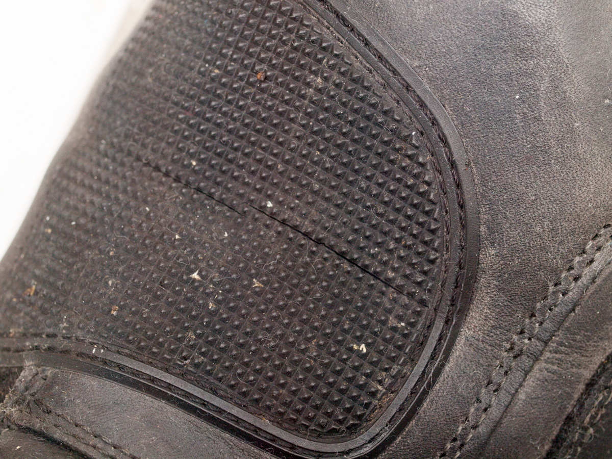 Pět let provozu zanechalo na botách jen malé škody. Je poškozen lak. Ale to by si čekal málokdo, že boty přežijí takovou dobu bez šrámu. Na nártu pravé boty praskla krycí guma. Je to trochu překvapující, protože větší zátěž je na levé noze kvůli řazení. Naštěstí, toto je jen kosmetická závada, protože pod gumou je kůže a pod kůži membrána, takže na funkci to nemá vliv. :-)