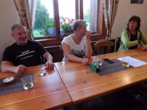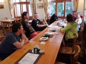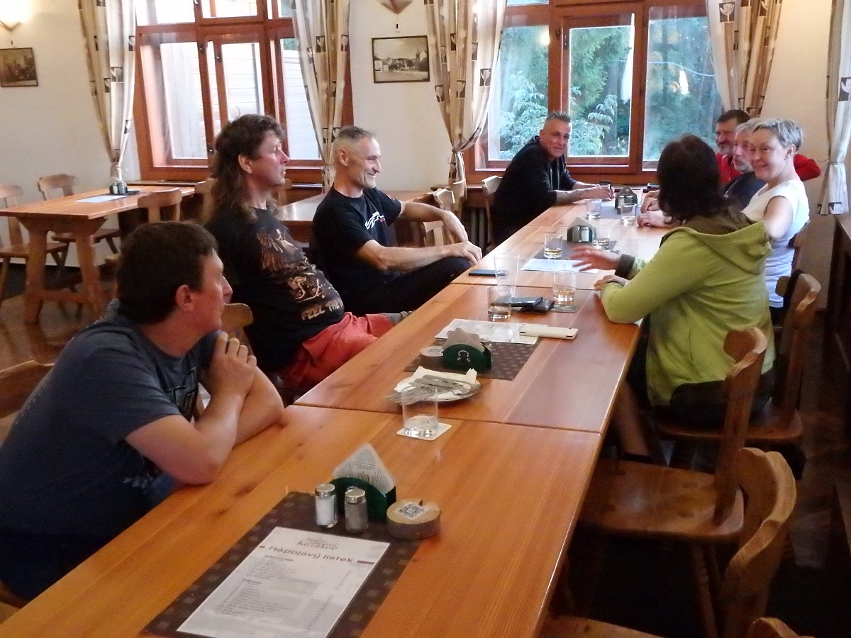 Na místo srazu se patří dorazit jako první, tedy minimálně když jste jeho pořadatel. Což se mi k mé ostudě nepodařilo. O zdržení se mi postarala zasekaná doprava v Turnově. Dorazil jsem pár minut po zahájení srazu a zrovinka jsem viděl na parkovišti u chaty VFrošťáka. Prý dorazil pár okamžiků přede mnou, ještě o něco rychlejší byl Šéba. Ten už se stihl i ubytovat. Počasí našemu setkání přálo, a tak jsme mohli posedět venku a kochat se panoramaty nedalekého Českého Ráje a Krkonoš. Během odpoledne se začalo sjíždět mužstvo, slezská buňka klubu a pak i ta jihočeská. Jarák s Pavlou a Nororon, to je klasika, na kterou je spoleh. Nejdéle se čekalo na Vlada s Jankou, zpoždění opět padlo na vrub dopravy. Holt páteční odpoledne v HK není žádná selanka. Po telefonické dohodě jsem pouze domluvil u personálu chaty, aby jim dal stranou večeři, protože pár našich přátel dorazí později. Kdo ovšem proti všem předpokladům nedorazil vůbec, byl Scalla. Bohužel jej zradilo zdraví, tak se budeme těšit na jaře příštího roku a přejeme brzké uzdravení.