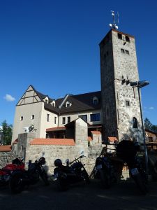 Žhavil jsem mobil, ale nikdo z té trojice mi to nebral. Podařilo se mi dovolat asi až po 20 minutách. Tak prý jsou v Pekelných dolech na kafi. Když nás nedojeli, tak jim bylo jasné, že jsme jinde, a protože zmiňované místo je mezi motorkáři známé, tak si zde udělali přestávku. Domluvil jsem s nimi, že setkáme až večer.na chatě. Hodně mne to mrzelo, ale už se stalo. Díky tomu, že nám bohužel odpadl výjezd na Ještěd a prohlídka hasičského muzea proběhla rychle, tak zbyl ještě nějaký časový prostor. Napadlo mne ještě jedno zajímavé místo, které by stálo za vidění. Liberecká výšina, druhá nejslavnější liberecká rozhledna. Měl jsi ji v širším výběru bodů, které chci ostatním ukázat, ale nakonec se do finále nedostala. Cestou k ní jsem si přesně vybavil, proč jsem ji ze seznamu vyškrtl. Vede k ní naprosto otřesná cesta, použít zde výraz silnice by bylo urážkou silnic. Samotná budova rozhledny je velká rarita, kameny na její výstavbu pocházejí ze středověkých budov Norimberku, které se koncem 19. století bourali a syn Johanna Liebiga (jeden z nejúspěšnějších podnikatelů v tehdejší monarchii), Heinrich je sem nechal dovézt a vystavět z nich restauraci a rozhlednu v podobě středověkého hradu, to vše v letech 1900-1901.