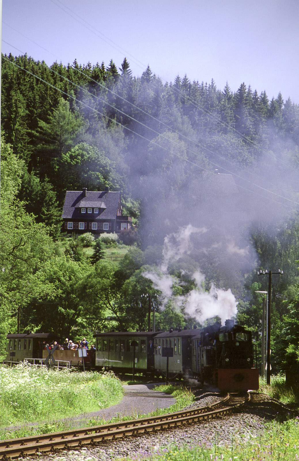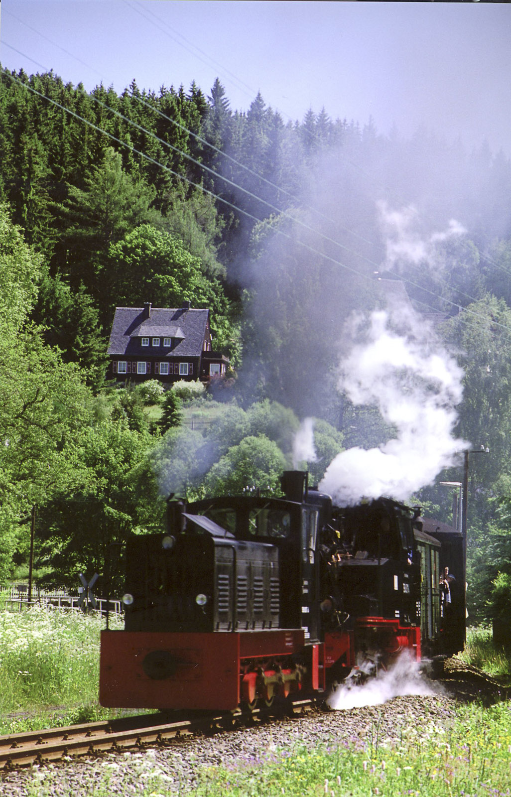 U Olbernhau se stáčíme k jihu. Před Marienbergem najíždíme na místní silnici, která nás navede na silnici S216. Následně se napojujeme na místní S219, která se opět krásně klikatí německou stranou Krušných hor. Kousek za Schmalzgrube děláme přestávku. Ve stanici jsme si všimli parního vlaku, takže zastavujeme ve stráni nad tratí a čekáme, až vlak pojede. Dává si pěkně na čas. Rozhoduji se tedy slézt po louce dolů a udělat fotky z bezprostřední vzdálenosti. Čekáme možná deset minut a vlak pořád nejede. Zanedlouho neodolají ani kluci a tak za chvíli ležíme v trávě všichni tři a čekáme na vlak. No konečně. Lokomotiva profuní kolem. Vagóny jsou plné mávajících lidí, všichni se culí a vypadají velmi spokojeně. Vlak zmizel za zatáčkou a my se drápeme zpátky k motorkám. Nechali jsme tady 45 minut a před námi je cesta dlouhá. Chci nastartovat a startér ani necvakne. Poněkud mi zatrne. Vypnu a zapnu klíček. Nic. Začínám přemýšlet, koho poprudím s odvozem motorky. Ondra se ptá, jestli nemám zmáčknutý chcípák. Mám. Vůbec netuším, jak se mi ho podařilo zmáčknout. VFRka startuje na  první šup.  Pokračujeme po S265 do Barensteinu, kde odbočujeme doleva přes koleje. Krásná silnice se klikatí do kopce mezi domy. Jen je to tady trošku zanedbanější. A hele! Tak cigoši už bydlí i v Německu?! Jo, teď zjištuji, že ne. Že jsme spolu s železnicí přejeli také hranici a jsme ve Vejprtech. Tak to už se nedivím. Ale silnice je parádní. Míjíme vodní nádrž Přísečnici a odpočujeme na silnici II/233 směrem na Měděnec.  Zvláštní silnice. Na jedné straně pohraniční hory, na druhé straně luxusní výhled na elektrárnu Prunéřov. Stavíme na pár fotek, kluci dají cígo. Silnice nás dovede až na Boží dar, kde točíme po I/25 na Jáchymov. Tady poznávám svou chybu v plánování, když odbočíme na Albertamy. V mapě to vypadalo jako silnice II třídy, takže jsem ji upřednostnil před cestou do Jáchymova. Chyba. Silnice byla tragická. Místy sice nový asfalt, ale velmi homeopaticky.  Takže jsme střihli zatáčku a za ní šlus. Znova tankodrom. Být spravená, mohlo to být pěkné svezení. Po silnici II/219 doskáčeme až do Kraslice. Tam stavíme na Agipu na benzín. Kluci chtějí nějakou pauzu na jídlo. Je poledne  a před sebou máme zhruba 2/3 cesty. Ptám se, jestli chtějí do hospy, ale že to vezme další čas. To uznávají, takže nakonec to řešíme Krokoušema (Crocodille) z pumpy. Honzovi s Ondrou se moc nechce, prý je bolí zadek. Na pumpě prosedíme půl hodiny. Honza už moc Dubou neřeší. Ale nedá se nic dělat. Musíme dál. Po II/210 zanedlouho přejíždíme hranici zpět do Německa. Z Klingenthalu  jedeme po B283 a kolem hranice se vinoucí B92. Míjíme Schonberg a jsme zase v Čechách. Před Chebem najíždíme na silnici I/6 a jsme zase v Německu. Připadám si jako v té hře od Svěráka/Smoljaka – jdu na sever, a jdu na jih... .-)) Ale ježdění po jedničkách není naším cílem, takže hned za hranicí najíždíme na místní ST2178 a za Neualbenreuthem si užíváme zatáčky na ST2174. U Tishenreuth se po ST2173 opět blížíme hranici a dále ji kopírujeme po ST2154 přes Weidhaus, kde křižujeme dálnici D5 do Furth im Wald. Jo, kdeže ty časy jsou, Rozvadov/Waidhaus, Folmava/Furt im Wald. Tady stály kilometrové fronty, které čekaly na zprocesování milostpány celníky. Jako kluk jsem obdivoval řidiče kamiónů. Když jsem po letech viděl ty nekonečné kolony, spíš jsem je litoval. Kousek za Furth im Wald dělám další pauzu. Kluci cígo, nějaké drobnosti z batohu k jídlu. Honzu už myšlenky na zítřejší Dubou přešly.  Skučí, že nemůže vymáčknout spojku a jede celou cestu na trojku, aby nemusel řadit. V tom má štěstí, že litrové SV toho pobere docela dost. A že už nemůže... A jak je to daleko... Ondra zkušeně mlčí. Přeci jen už jsme spolu něco kilometrů namotali, takže ho jet tak něco nevyvede z míry. Navrhuji Honzovi, jestli se nechce vrátit po dálnici do Prahy. Nakonec se rozhoduje pokračovat dále.  778 km za jeden denTakže po ST2161 a ST2140 přijíždíme k Bad Kőtzting, kde se napojujeme na silnici ST2132 do Arnbrucku. Tam nás již čeká další bonbónek. Silnice se kroutí zpět k šumavských kopcům do chráněné krajinné oblasti Bayerische Wald. Po ST2326 překonáváme hřeben a sjíždíme do Arrachu, odkud vede krásná silnice ST2154 směrem k Velkému Javoru a ArberSee. Tady je pěkná vyhlídka s parkovištěm a malou kamennou rozhledničkou. Slunce se chýlí k západu. Ondra fotí, Honzovi je všechno jedno. Cestu kolem Javora tedy vynechávám a sjíždíme rovnou dolů na Bayerisch Eisenstein a Železnou rudu. Tam stavíme na Benzině, bereme palivo. Taky toho začínám mít dost. Dávám si BigShocka. Kluci cígo. Honza se ptá, jak je to daleko. Nevím přesně, ale říkám, že už jen kousek. Ve srovnání s tím, co jsme už ujeli.  Nedaleko se baví partička motorkářů na sportech od Klatov. Asi si byli taky pojezdit na hezkých cestách. Ale určitě nebudou mít v zadku najeto, co za dnešek my. Z Železné Rudy je silnice také opravená a bylo by to pěkné svezení, nebýt únavy. Avšak vím, že Honza je hotový mnohem více a to mne motivuje. Je to fajn jezdit ve více lidech. Nic tak nepotěší jak neštěstí druhého.  Za Hořákovem se už silnice napřimuje a Šumavu necháváme za zády. V Klatovech zabočíme na Nepomuk po silnici II/191. Moc to tam neznám a trasa je taky naplánovaná jen podle mapy a zatáček. Do Nepomuku však nejedem, odbočujeme na silnici II/117. Tady nastává psychologický zlatý hřeb dnešního dne. Silnice stojí za prd. Rozdrbaný asfalt, díry, štěrk. Pomalu se stmívá a v lese je už docela tma. Ondra má navíc na helmě tmavé plexi. Pro