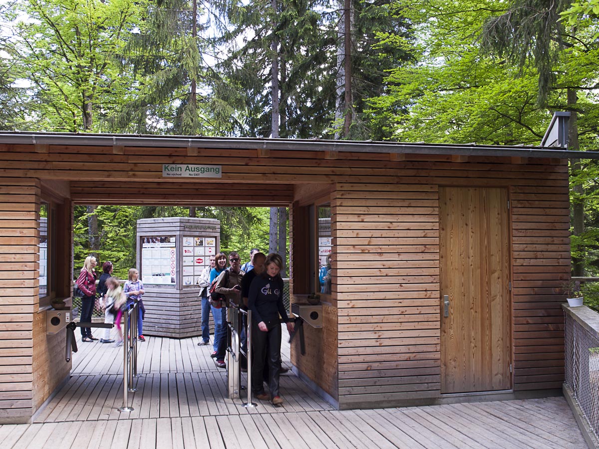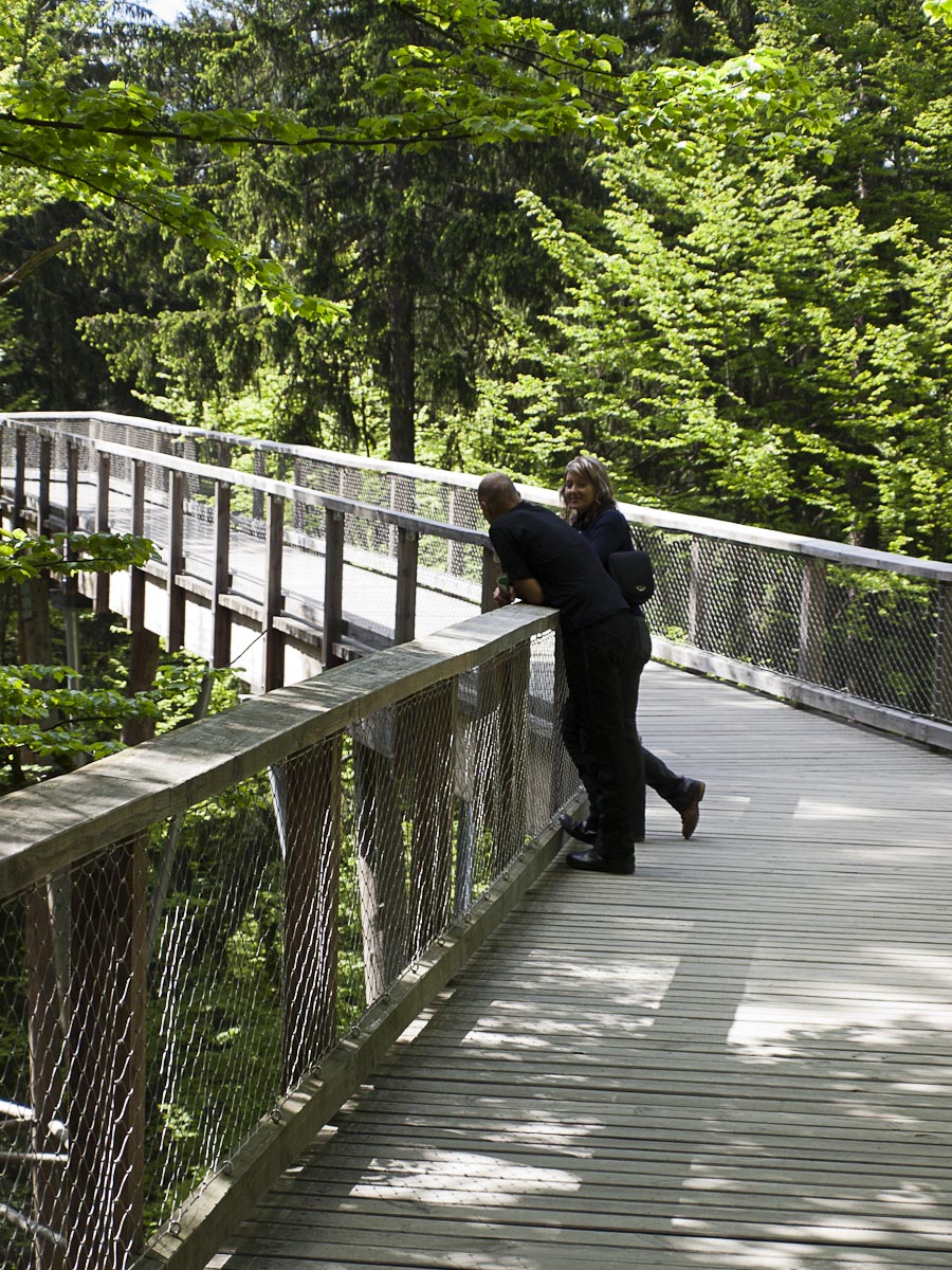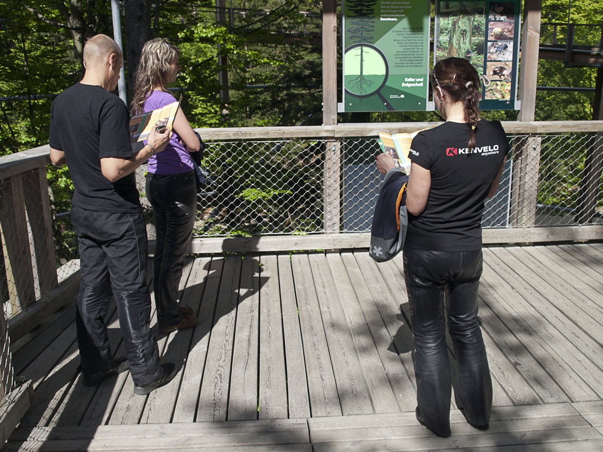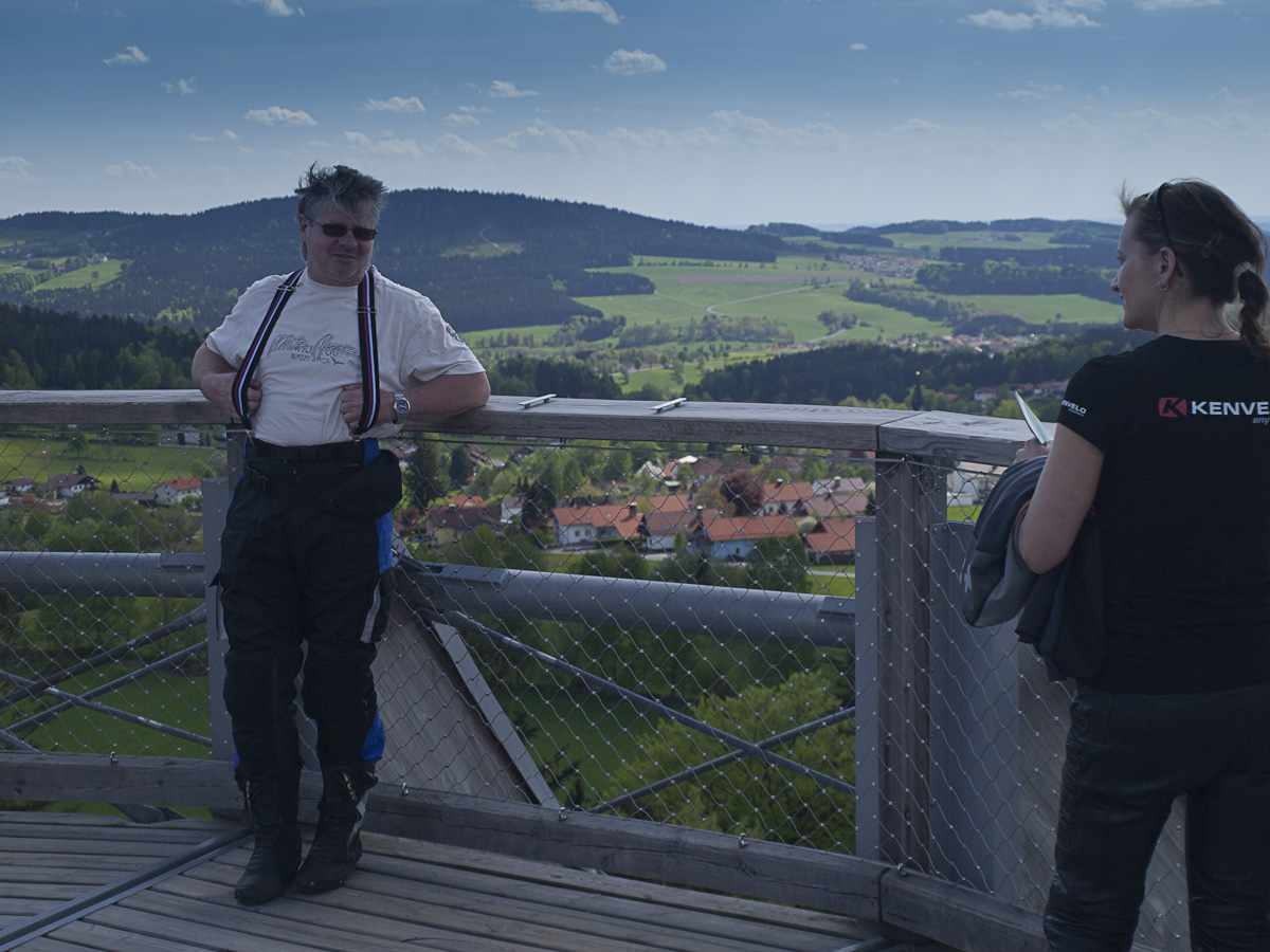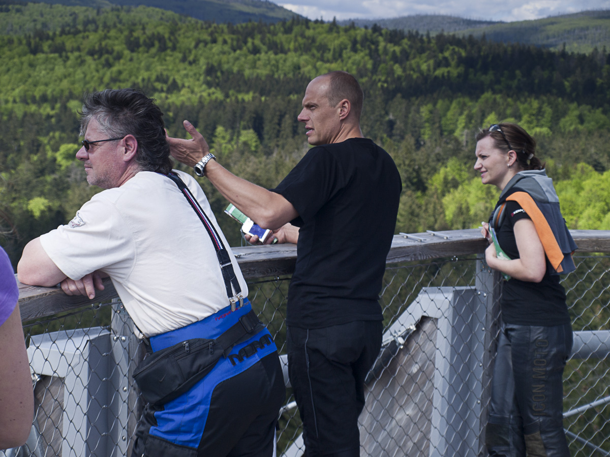 Z Helfenbergu do Haslach an der Mühl je B38 pěkně zakroucená a nabízí parádní svezení, stejně jako úsek z Oeppingu do Wegscheidu, který už leží v Německu. V Německu ani Rakousku se Den osvobození neslaví, takže na silnici je běžný denní provoz, který není nijak silný. Před Wegscheidem sjíždíme na ST2130 a ST2630 na Freyung. Zde přetneme B12 vedoucí od Strážného a po ST2127 dojedeme do Neuschönau. Tady se nachází Stezka v korunách stromů. Chvíli zmatkujeme s parkovištěm, protože na některé motorky nesmí. Ale hned u silnice je parkoviště s vyhraženým stáním pro motorky a úschovnými boxy pro helmy a věci, které nechcete nosit s sebou.