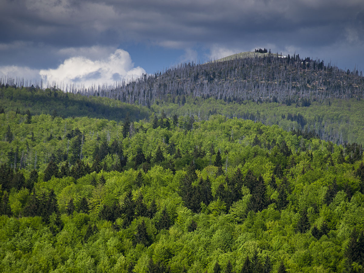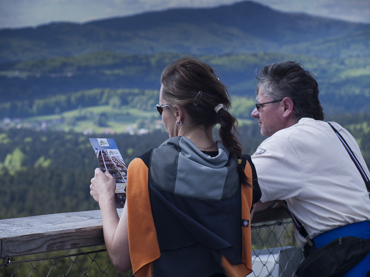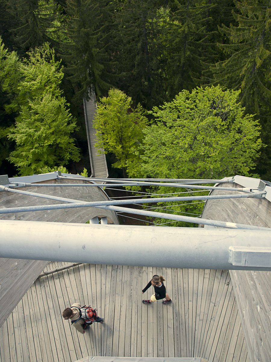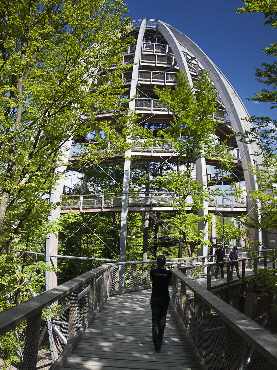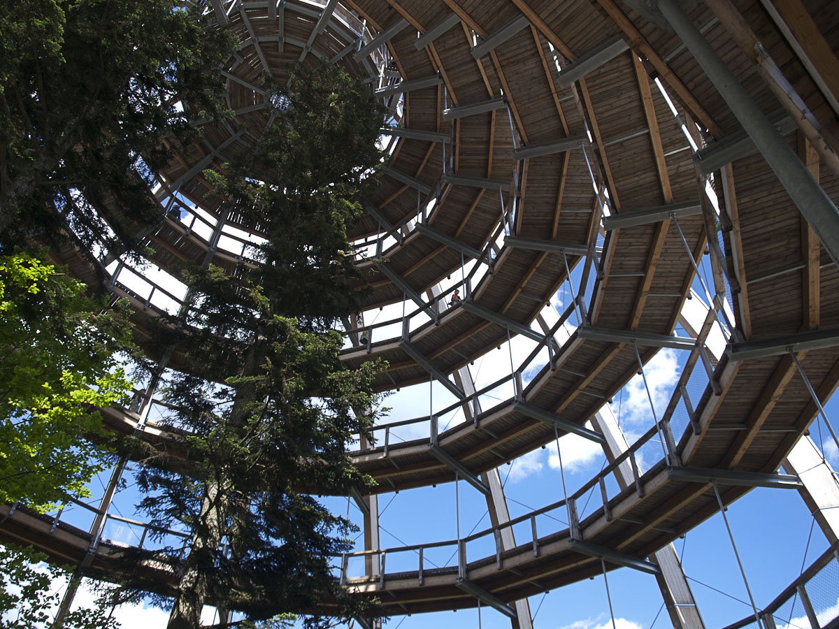 Z Helfenbergu do Haslach an der Mühl je B38 pěkně zakroucená a nabízí parádní svezení, stejně jako úsek z Oeppingu do Wegscheidu, který už leží v Německu. V Německu ani Rakousku se Den osvobození neslaví, takže na silnici je běžný denní provoz, který není nijak silný. Před Wegscheidem sjíždíme na ST2130 a ST2630 na Freyung. Zde přetneme B12 vedoucí od Strážného a po ST2127 dojedeme do Neuschönau. Tady se nachází Stezka v korunách stromů. Chvíli zmatkujeme s parkovištěm, protože na některé motorky nesmí. Ale hned u silnice je parkoviště s vyhraženým stáním pro motorky a úschovnými boxy pro helmy a věci, které nechcete nosit s sebou.
