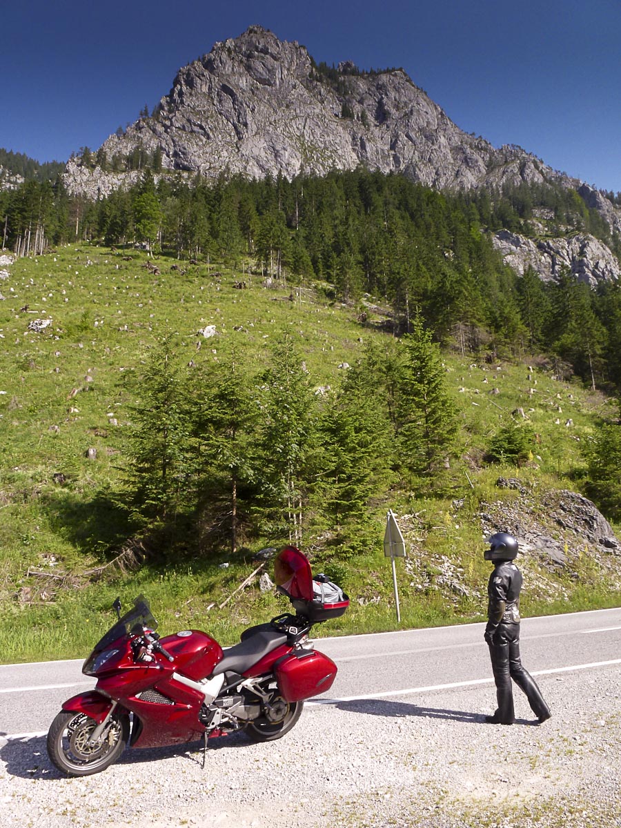 První odbočku na Mariazell u Lunz am See míjíme a odbočíme až na křižovatce s B71. Což je opět dobrá silncie a zatáčky, zatáčky, zatáčky... V jedné pravotočivé se rozvášňuji poněkud příliš a když motorku prudce naklopím, zase škrtneme svodem. Nedá se svítit, budu muset tu pružinu pro jízdu ve dvou fakt přitáhnout. Což se mi nechce. Hydraulický napínák je v tomto super. Stačí potočit kolečkem a je to. Tady to kvedlání s klíčem je otrava. Zvláště když jezdíte jednou sami a jednou ve dvou.