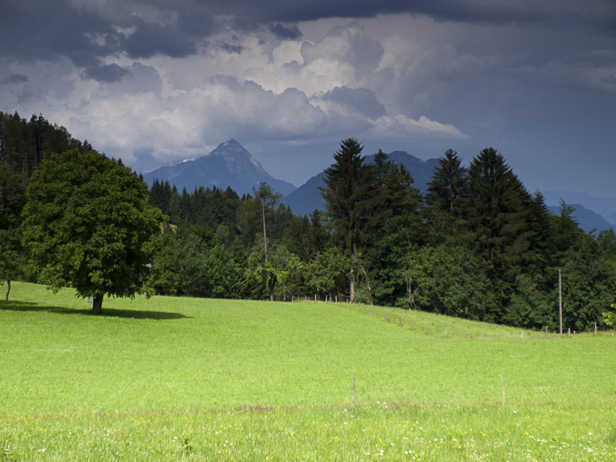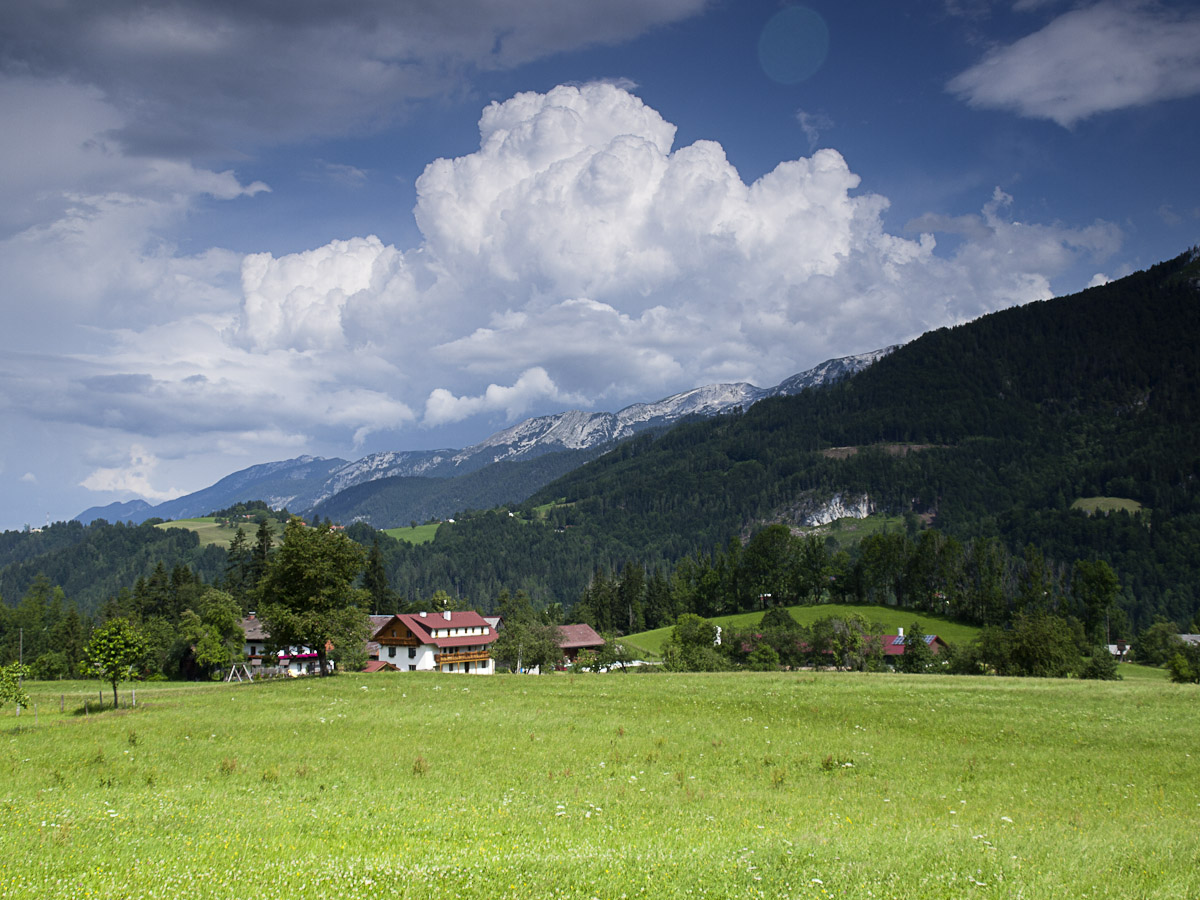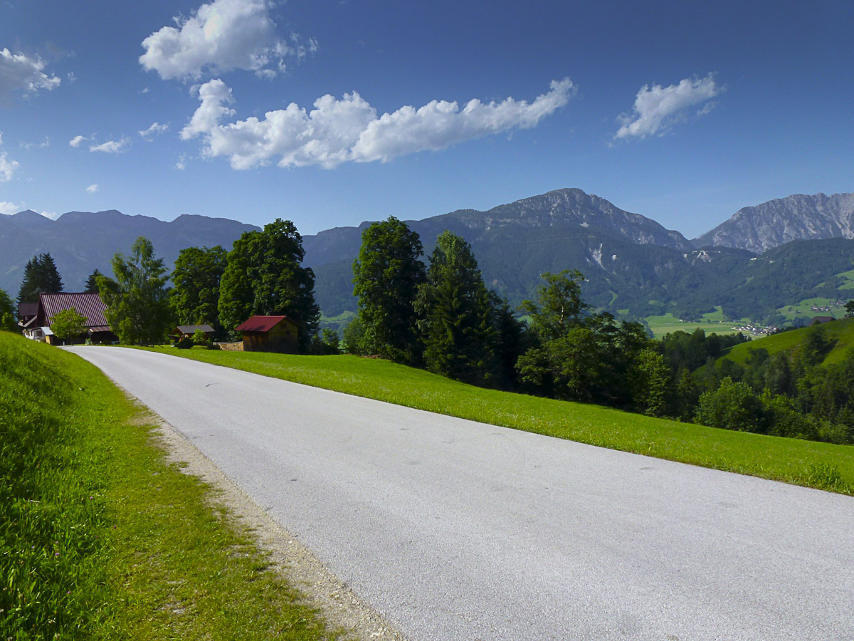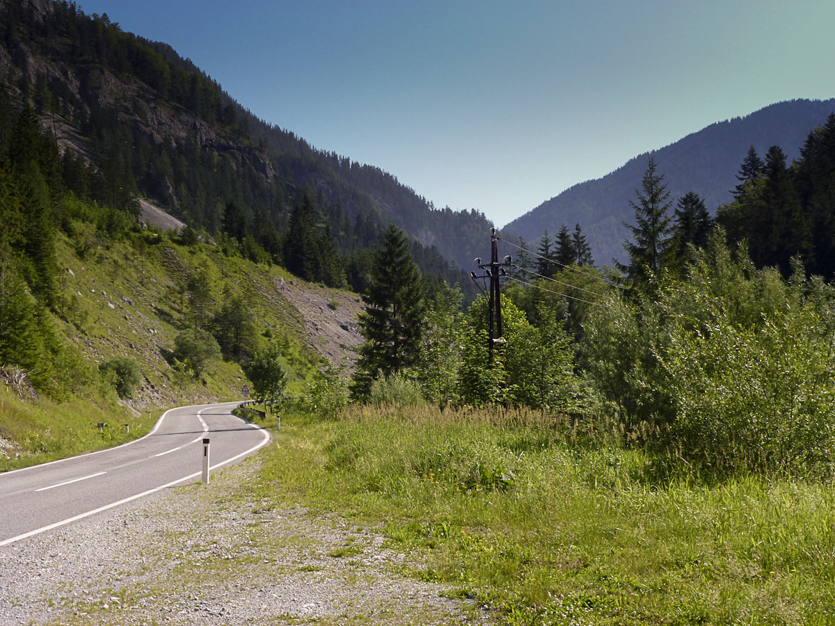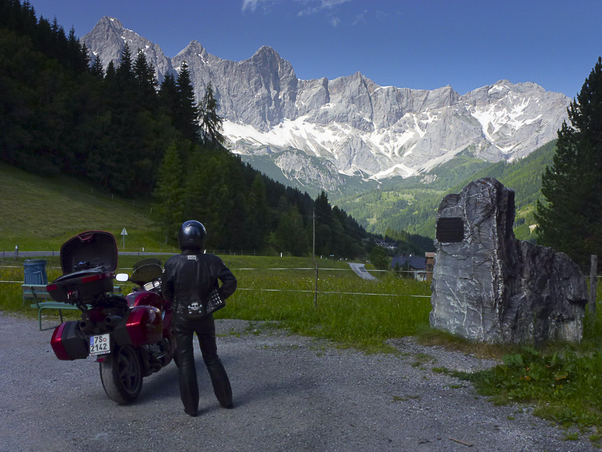 Po B99 jedeme jen pár kilometrů a sjedeme na silnici přes Filzmoos a Ramsau am Dachstein. A pak dále po B320. Docela příjemná zajížďka z hlavní silnice. Až na ty obce, které jsou dlouhé a cesta se táhne jak smrad. Je vedro a před námi se kupí černé mraky. Ale za chvíli budeme odbočovat, snad to vydrží. B25 je parádní. Zatáčky, zatáčky, zatáčky.