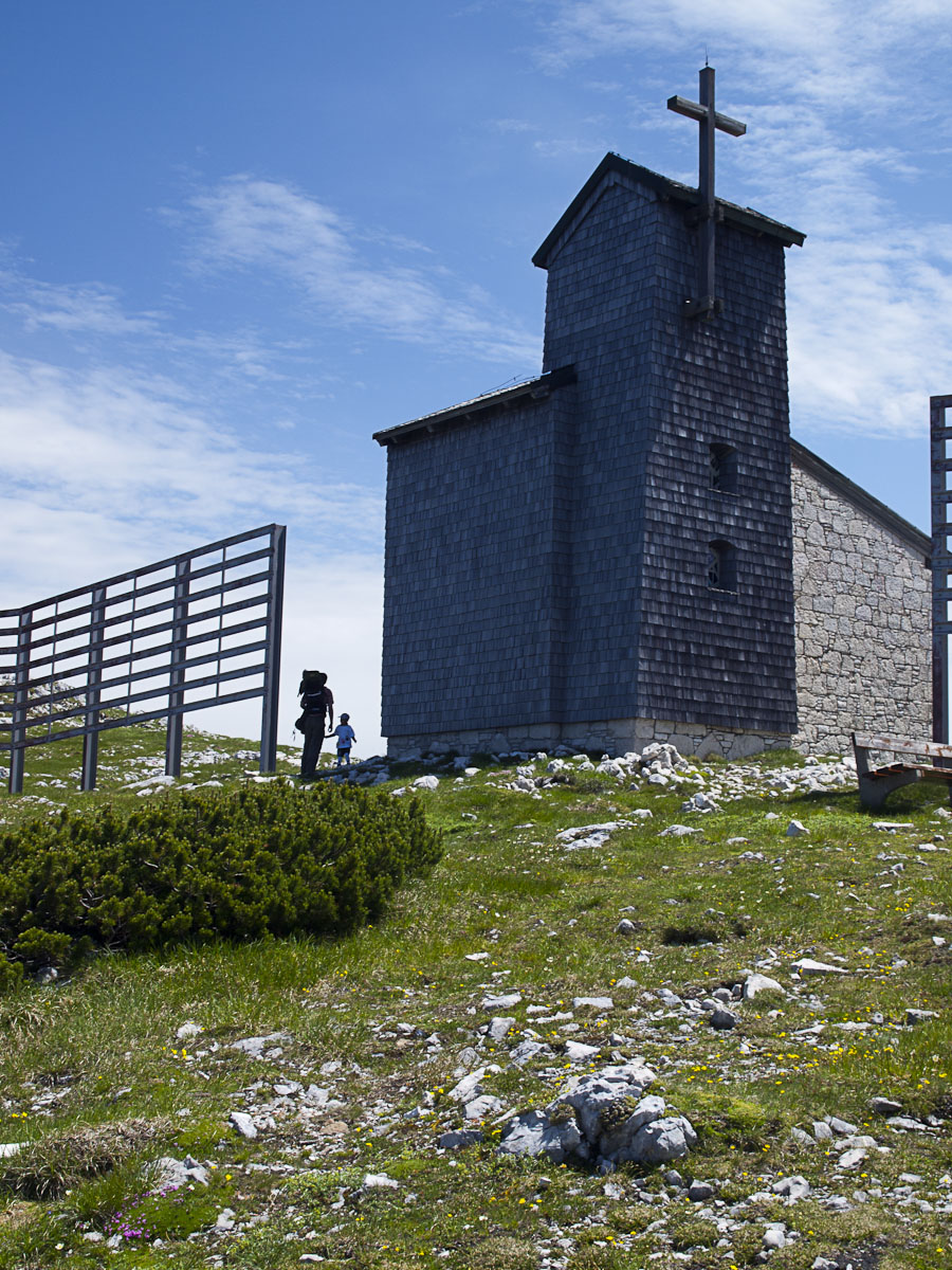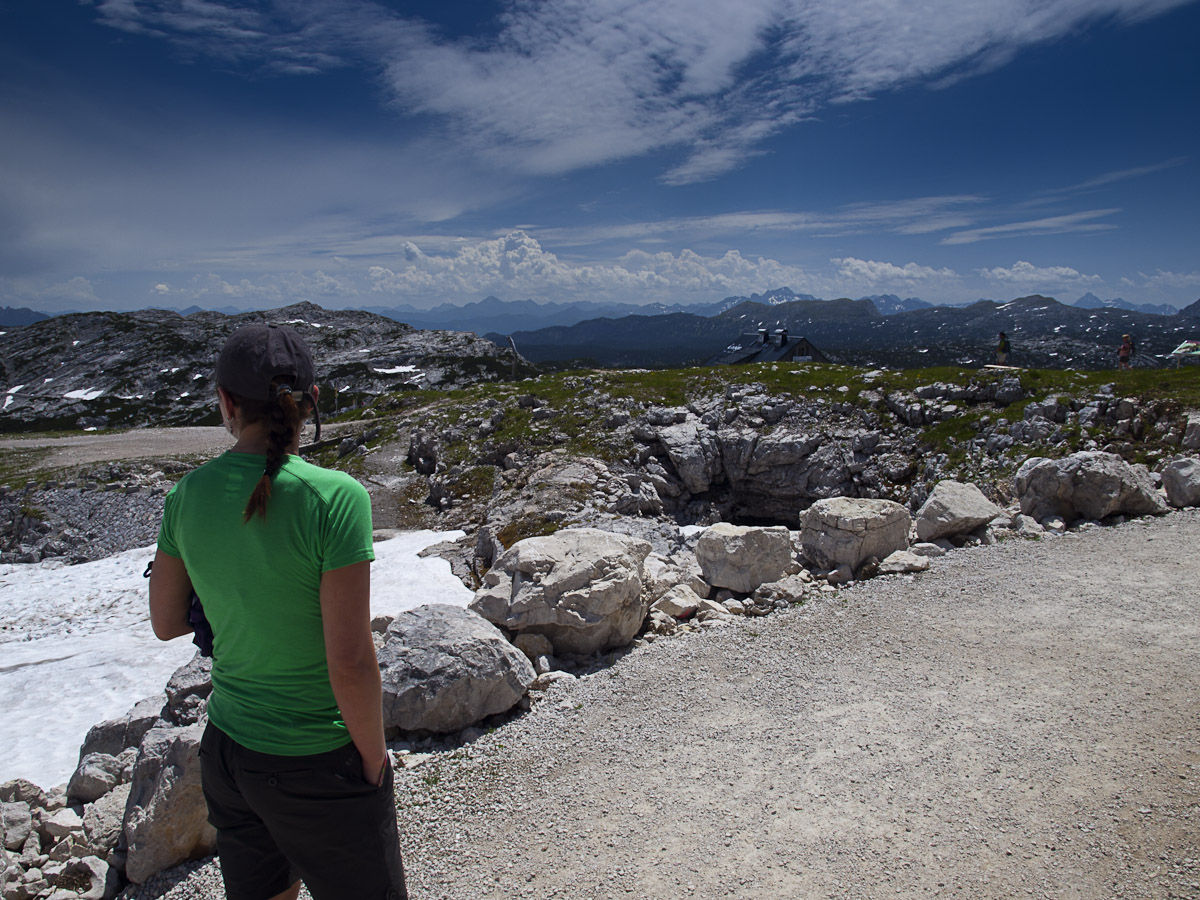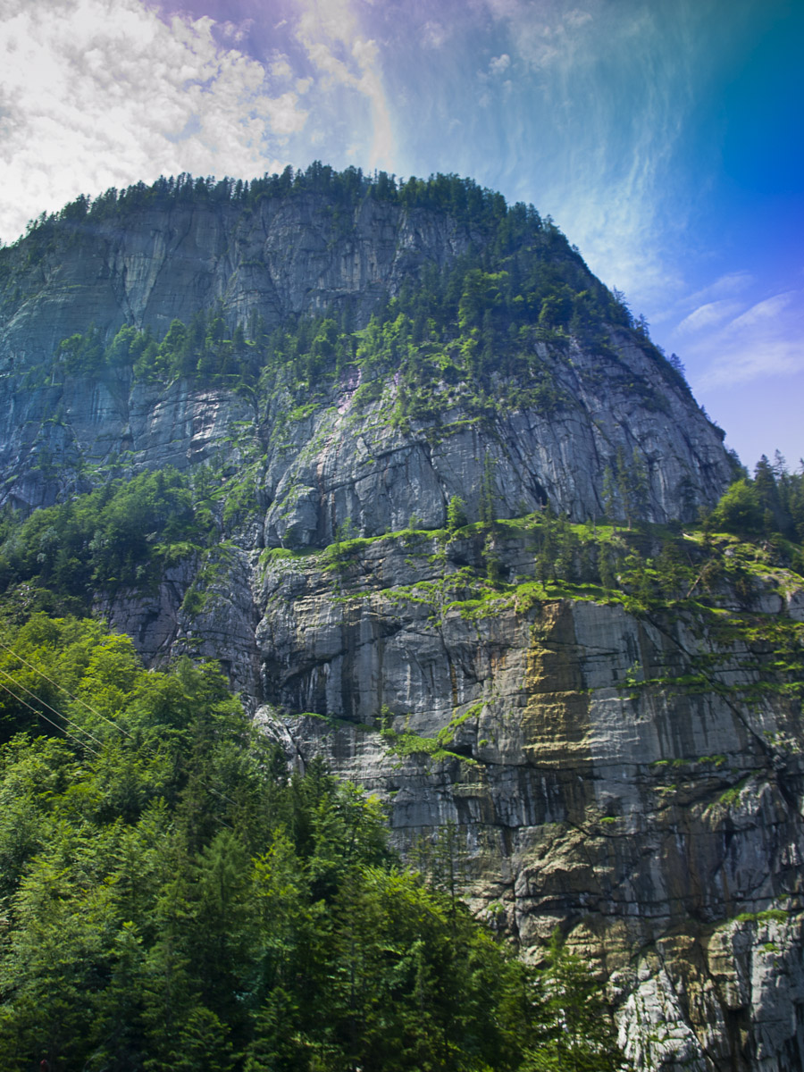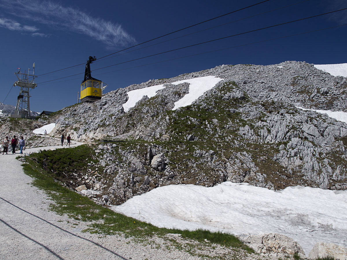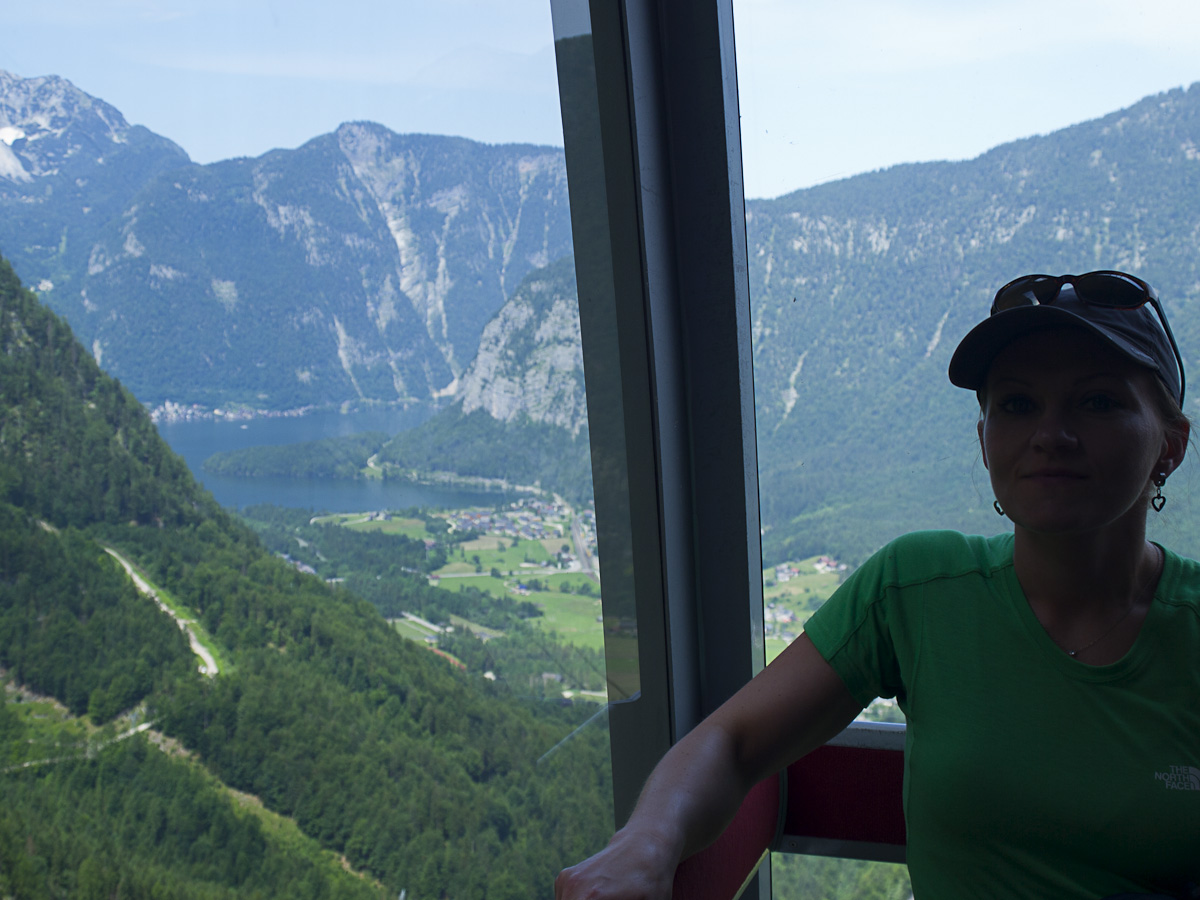 A za chvíli už frčíme lanovkou nahoru. První dojem je pozitivní. Mraky táhnou pryč a začíná svítit sluníčko. Lanovka stoupá strmě vzhůru a v jednom místě míjí docela těsně skalní stěnu. Tady se musí vegetace opravdu svědomitě prořezávat, jinak by kabina neprojela. Cesta nahoru na Krippenstein se skládá ze dvou úseků, takže na mezistanici přestupujeme do identické kabiny na vrchol.