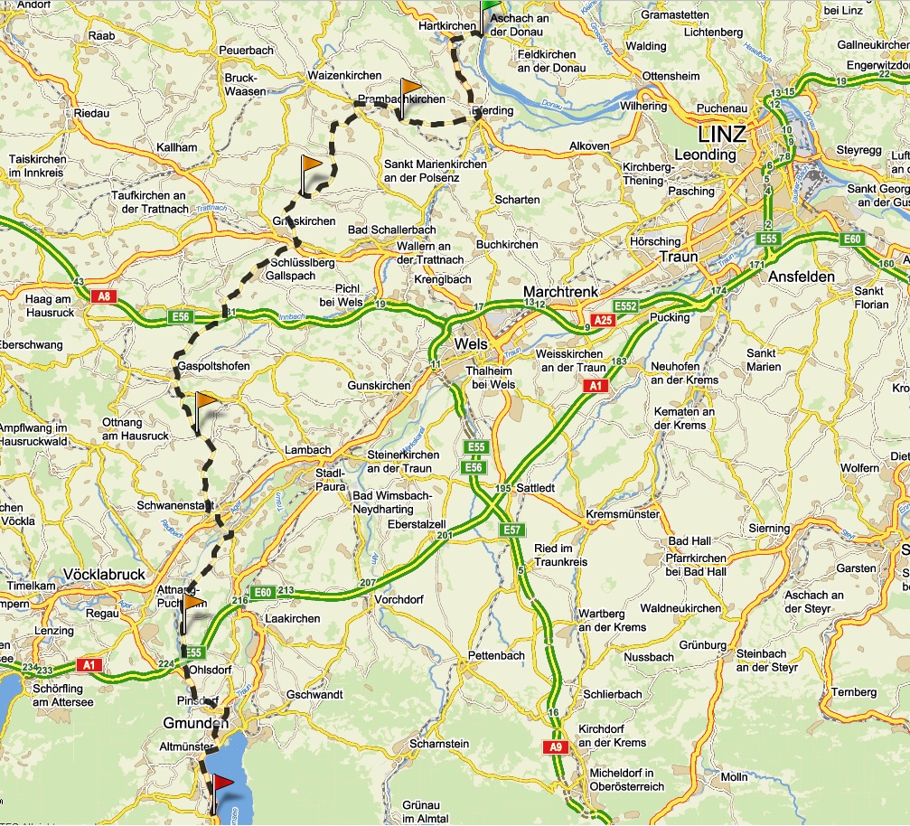 Aschach an der Donau – Eferding – Grieskirchen – Gastpoltshofen – Schwanenstadt – Gmunden (87 km)
