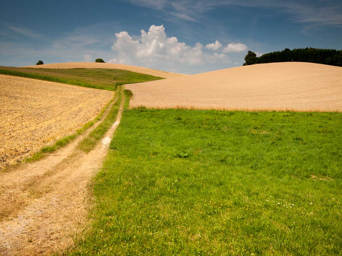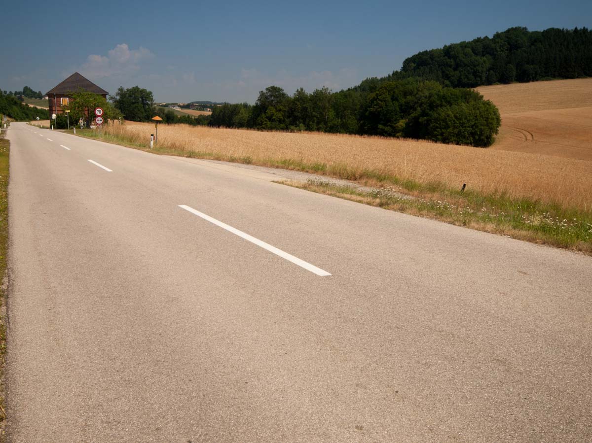 Díky předchozí etapě a objížďce Lince máme teď pár km k dobru. A před sebou žádnou dálnici. Jen mírně zvlněnou krajinu (jako z Windows, říká Marek) a liduprázdné okresky. Asfalt sice není pokaždé 1A, ale na druhou stranu také žádný tankodrom. Začíná být docela vedro. Ale na prázdných cestách můžeme jet poměrně svižně, takže to ani nepřijde.