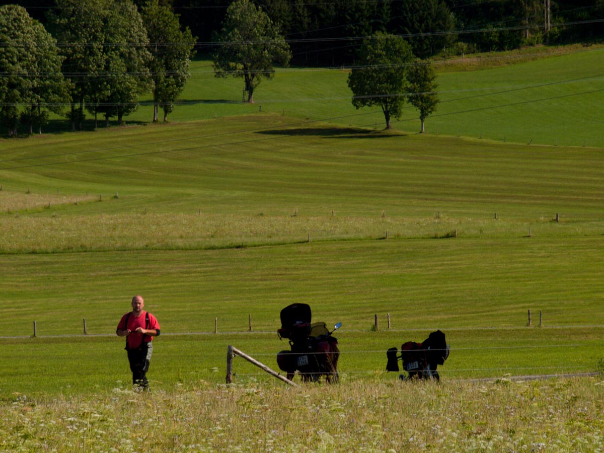 Liezen - Altenmark bei Sankt Gallen je opět motorkářská pohodička. Jen kousek za Rosenau nás bere nějaký frajer, na kterého nemáme pro změnu my. Nebo nechceme mít. Řeže to fakt statečně. V Altenmark stavíme na oběd na „Krásné vyhlídce“. Rozjímáme nad tím, jakou variantu Wiener schnitzel si dát, když nám hospodská nabízí hotovku. Přírodní vepřové, nějaký knedlík. Moc se mi do toho nechce, ale nakonec se s Markem vyhecujeme a jdeme do toho. Naše očekávání prorostlé flákoty se nanaplnilo. Libové masíčko jako dort. Holt dobré maso si nechají a flákoty asi vyvezou k nám. Dát si tohle jídlo v české hospodě bych asi neměl odvahu.