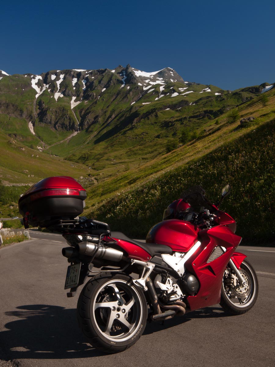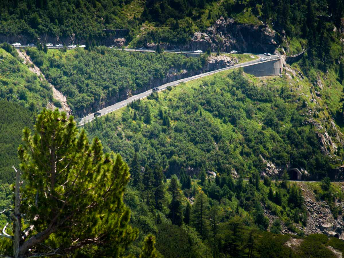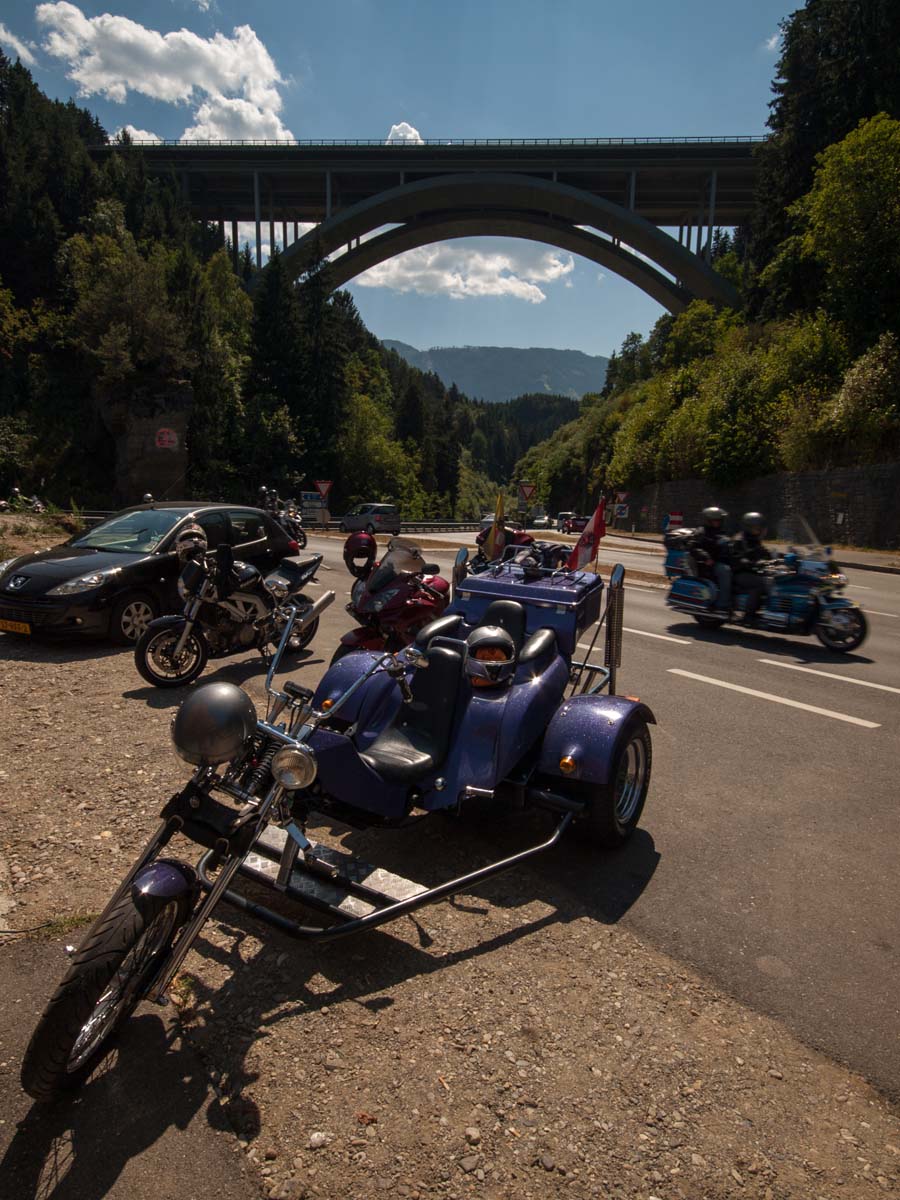 Ve Winklernu odbočíme na B106. Z počátku ještě pár zatáček, pak už jen nudná údolní silnice na Spittal an der Drau. Ten objíždíme horem po kozích stezkách a napojujeme se na B99. Údolní silnice, ale parádní, kopírující tok řeky Drávy. V Gmündu bereme benzín, kupujeme studenou vodu a míříme směr Malta. Kousek za městečkem je mýtnice. Dvě motorky 9,50 Eur a pak již stoupáme k přehradě. Silnice měří 14 km. Pěkná, s jedním nedostatkem. Semafory. Tunely jsou úzké, dvě auta se nevyhnou. Projíždí se kyvadlově. Interval je cca 15 minut. Vypínáme motory a pečeme se na slunci. Máme čas. Pod semaforem je časomíra se zbývajícím časem do zelené. Mezitím tunel vyplivne hejno motorek, následované šňůrou aut. Dvě minuty do startu. Oblékáme bundy, nasadíme helmy a rukavice. A jedem.