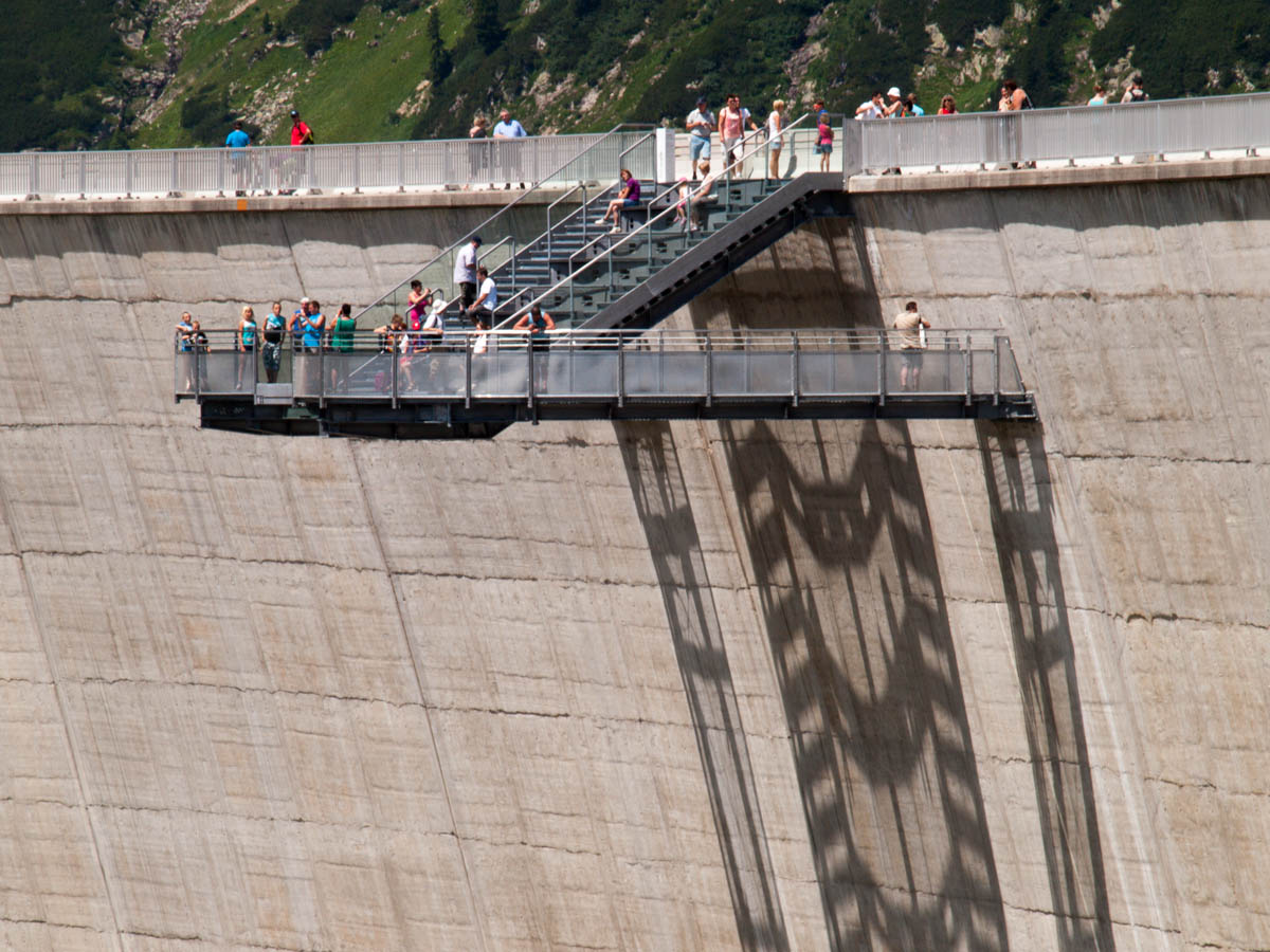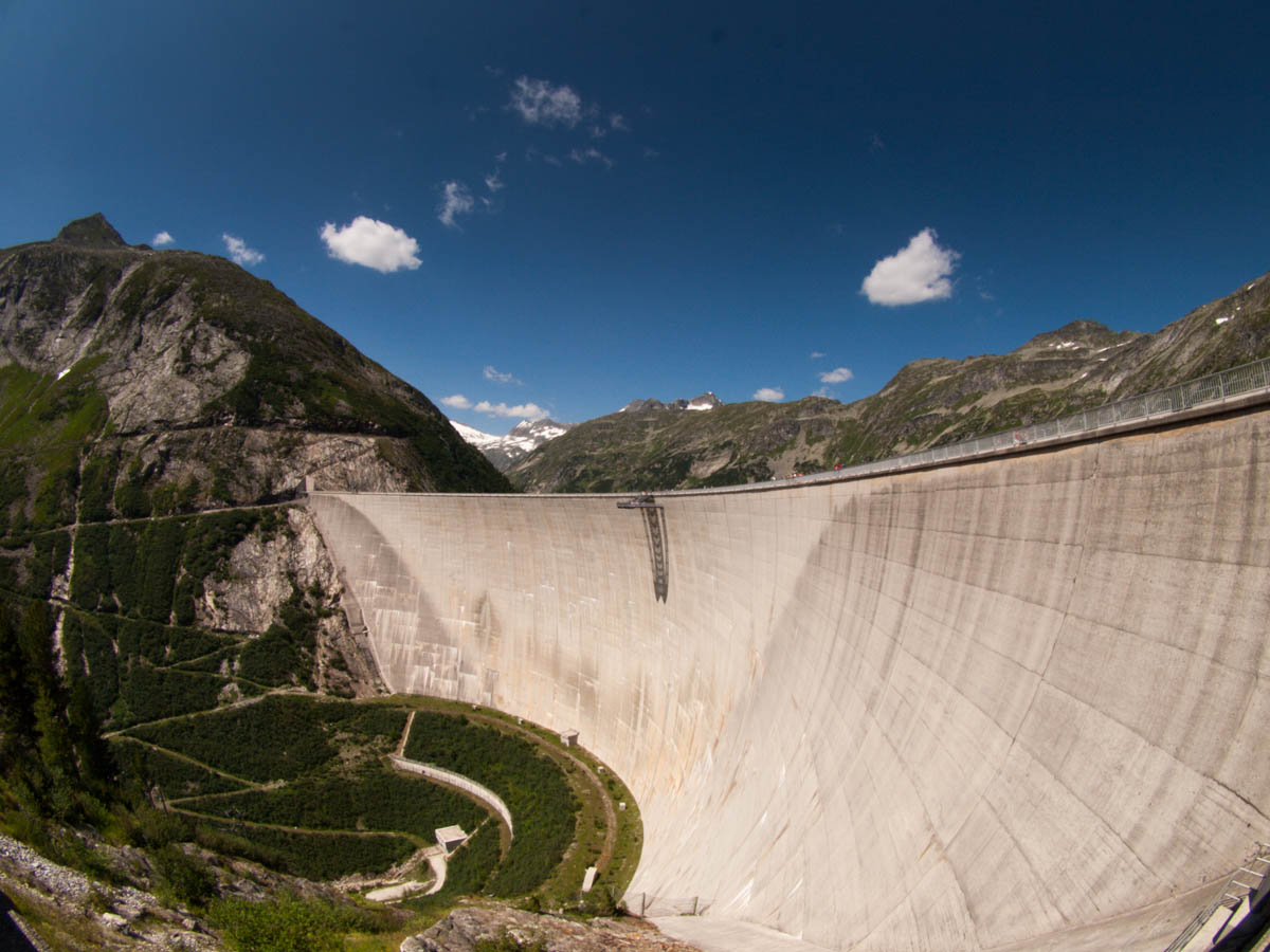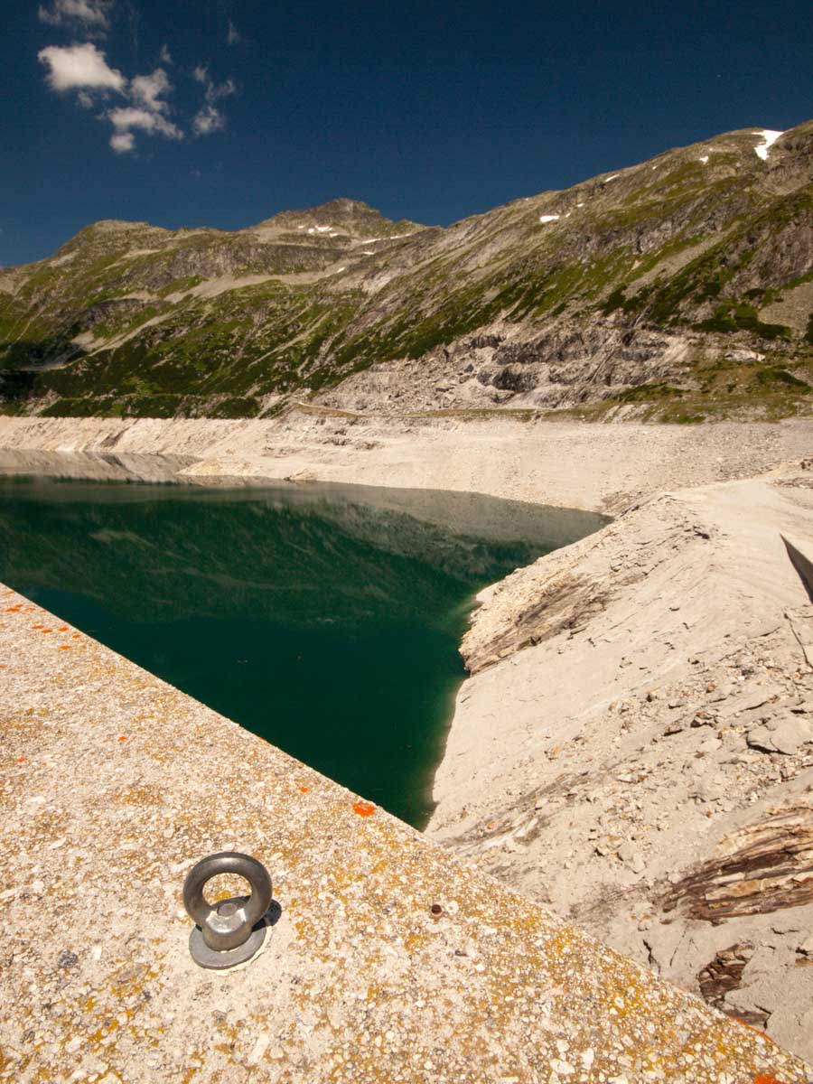 Přehrada je 200 m vysoké betonové monstrum. Jdu se podívat na informační ceduli. Přehrada ve výšce 1902 m n. m je zdrojem vody pro hydroelekrárnu. Dvě francisovy turbíny dávají výkon 120MW. Eletrárna je přečerpávací a je nejvyšší součástí soustavy dalších elektráren v údolí.