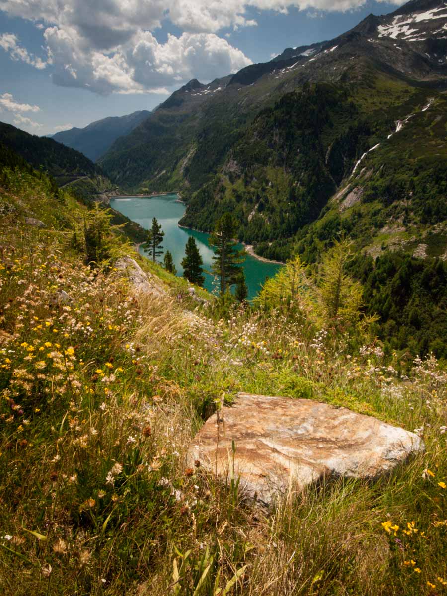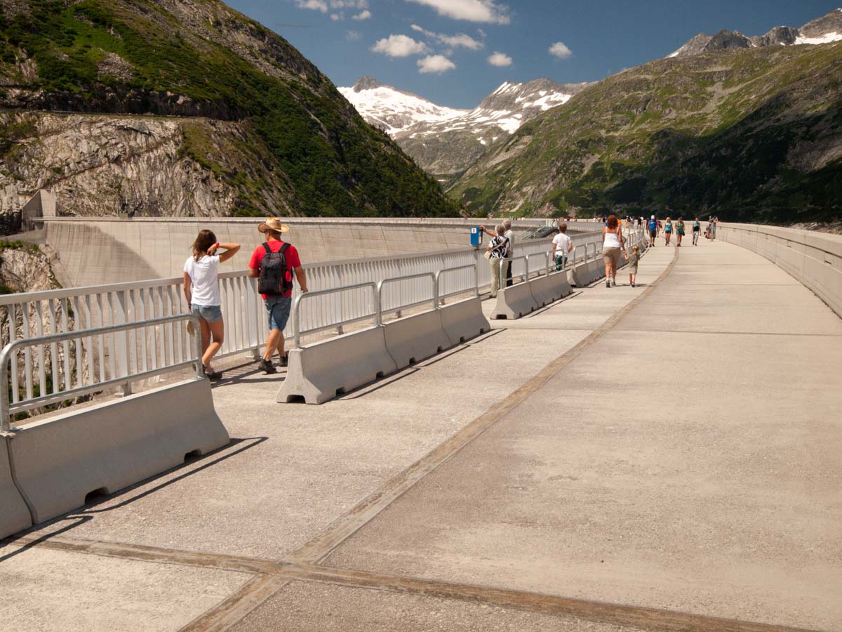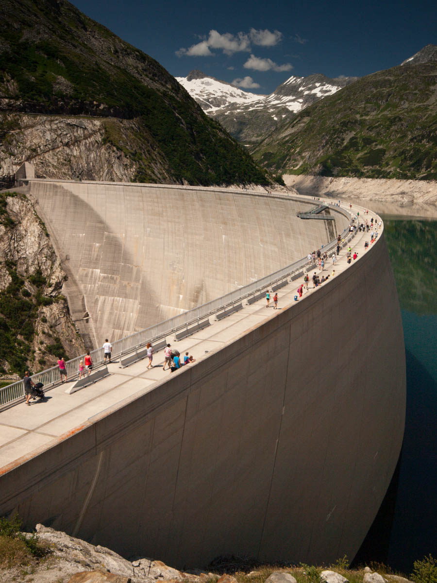 Přehrada je 200 m vysoké betonové monstrum. Jdu se podívat na informační ceduli. Přehrada ve výšce 1902 m n. m je zdrojem vody pro hydroelekrárnu. Dvě francisovy turbíny dávají výkon 120MW. Eletrárna je přečerpávací a je nejvyšší součástí soustavy dalších elektráren v údolí.