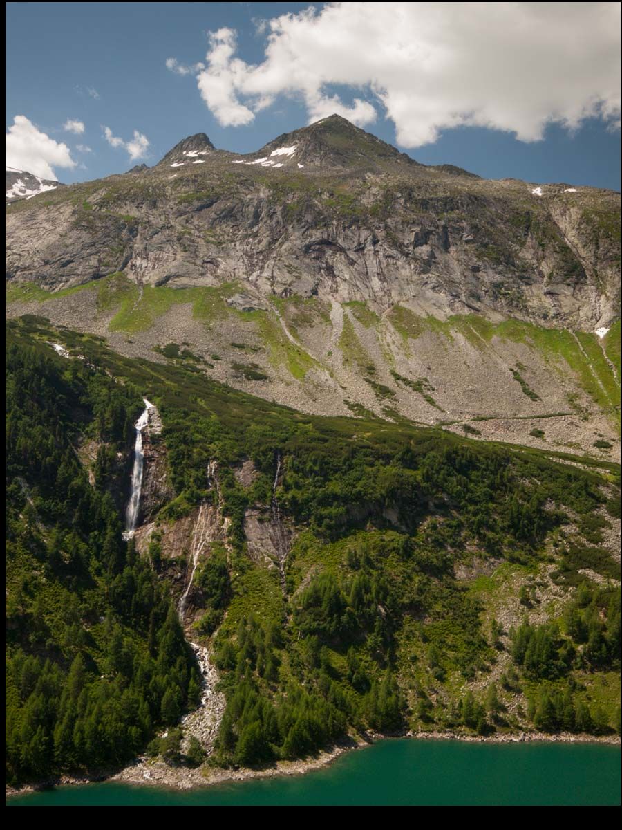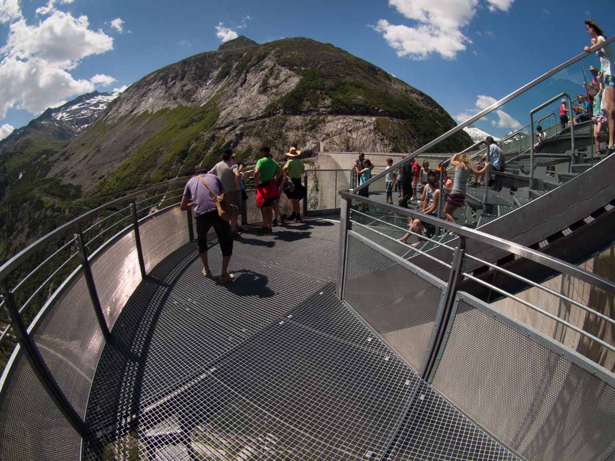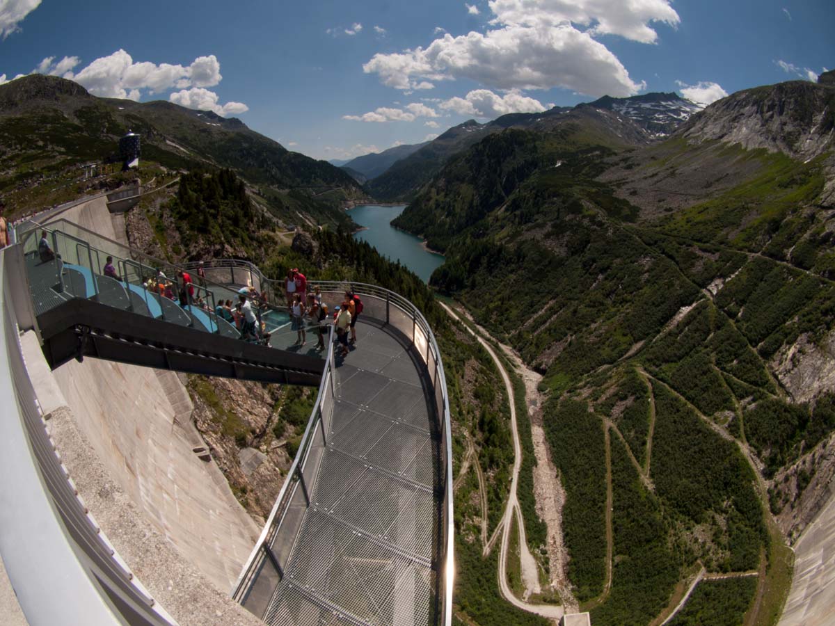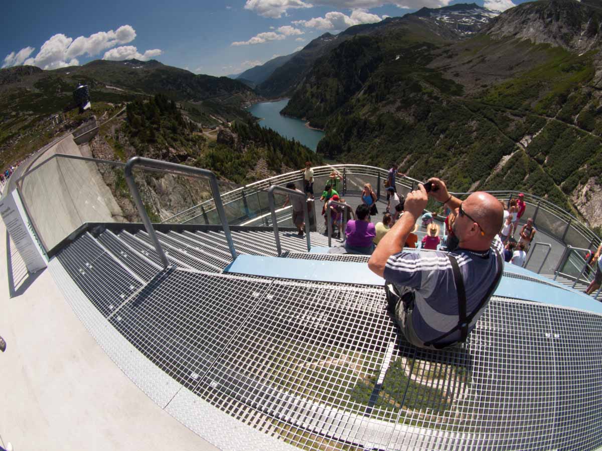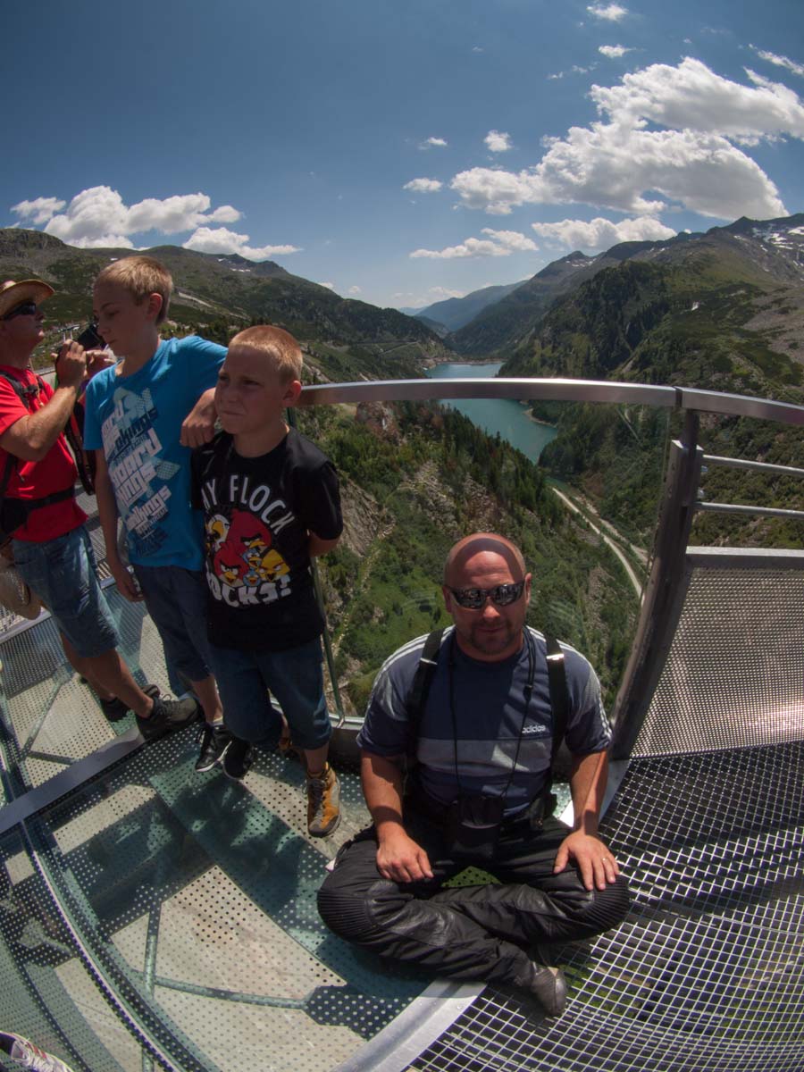 Součástí přehrady je visutá plošina s prosklenou podlahou – Skywalk, ze které se můžete pokochat výhledem do hlubiny. Pochopitelně se pokocháme. Fotím. Marek chce fotku, kde bude vidět VŠECHNO 😀 a zase vedro a semafory. Cesta zpět kopíruje tu, kterou jsme přijeli. Jinak to ani nejde. Do Zell jde sice jet i horem, ale to bychom už nejeli přes Glockner. A to by byla přece škoda, když máme zaplaceno, že? Kousek před Spittalem stavíme na pizzu. Údolní stošestka je peklo. Slunce peče jak prase a provoz je docela hustý. S přibývající nadmořskou výškou se naštěstí ochlazuje. Cestou si fotím „vodní mlýn“ u cesty. Jel jsem kolem tolikrát a nikdy si ho nevyfotil. Hlavně mne zajímalo, odkud tam teče ta voda. Jak vidíte, je to jen atrapa. Vodu čerpají z potoka a kolem točí elektromotor.