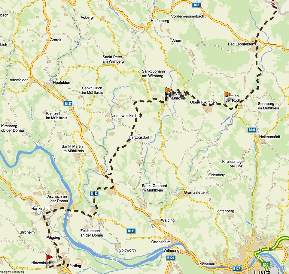 Touto trasou se vyhýbáme silnici B126 do Lince. Ta je sice docela pěkná, ale čím dál blíž k Linzi se vyznačuje hustším provozem. Tahle trasa je stejně hezká, možná i hezčí a provoz prakticky nulový. Malebná kopcovitá krajina, pěkné silnice. Šedesát kilometrů uteče jako nic. Za hodinu překonáváme majestátní tok Dunaje.